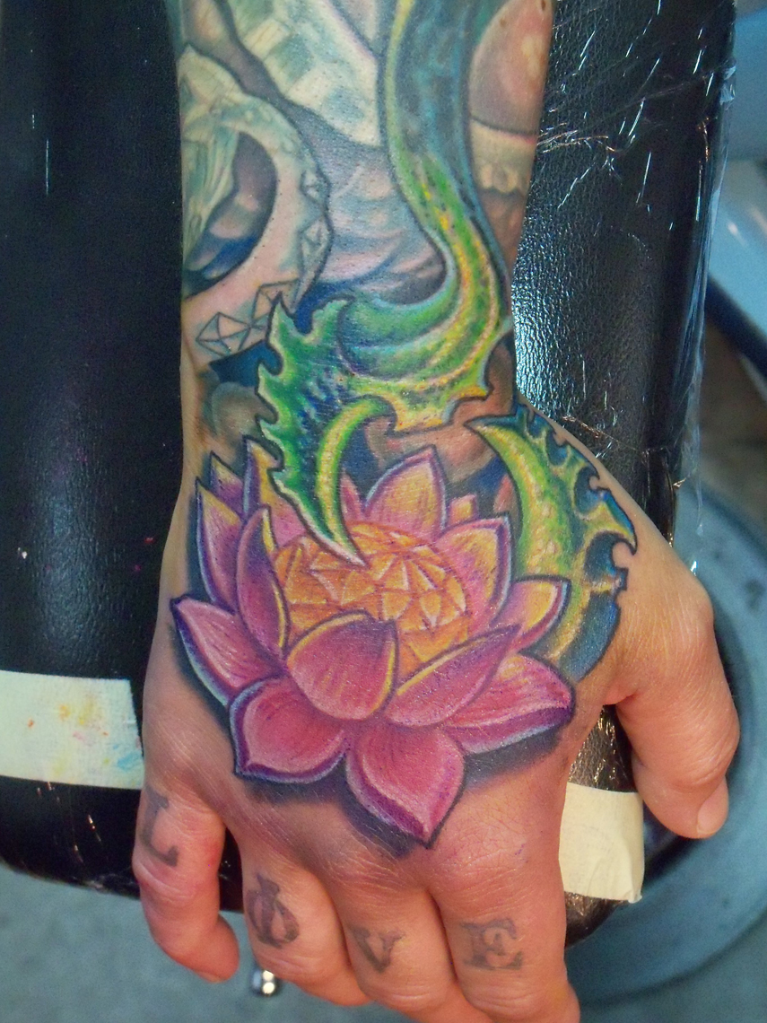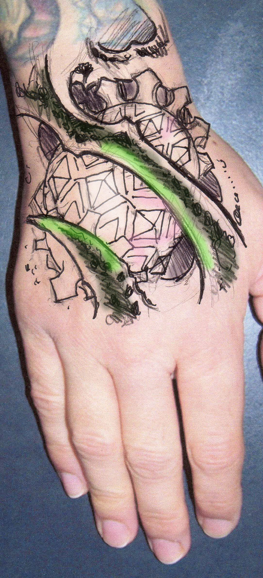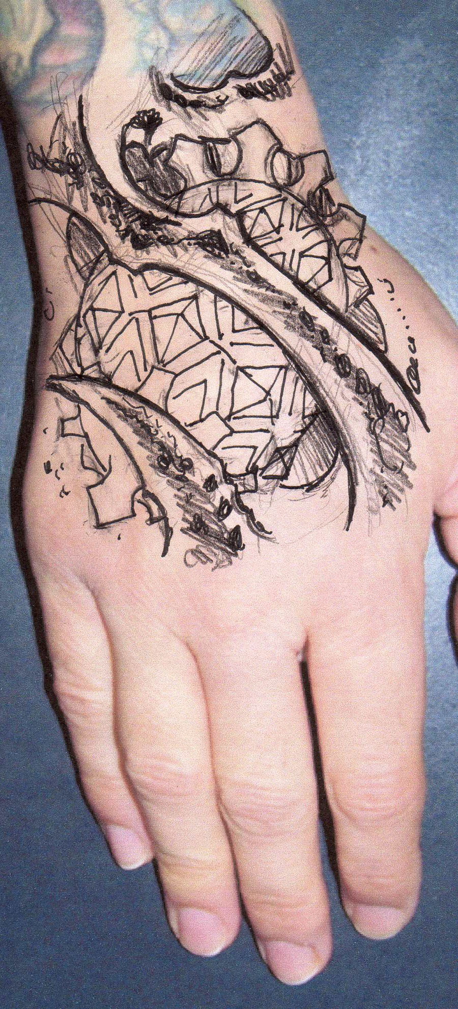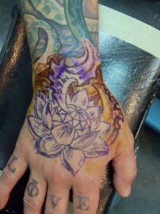 I had spent a lot of time thinking about who I wanted to tattoo my hand. It is a very visible place and not everyone who tattoos well can tattoo a hand well. In the end I decided to have Don create this tattoo for me. Don made my right sleeve for me about ten years ago and he had wanted to come further down the hand with it at that time and I wasn’t ready then.