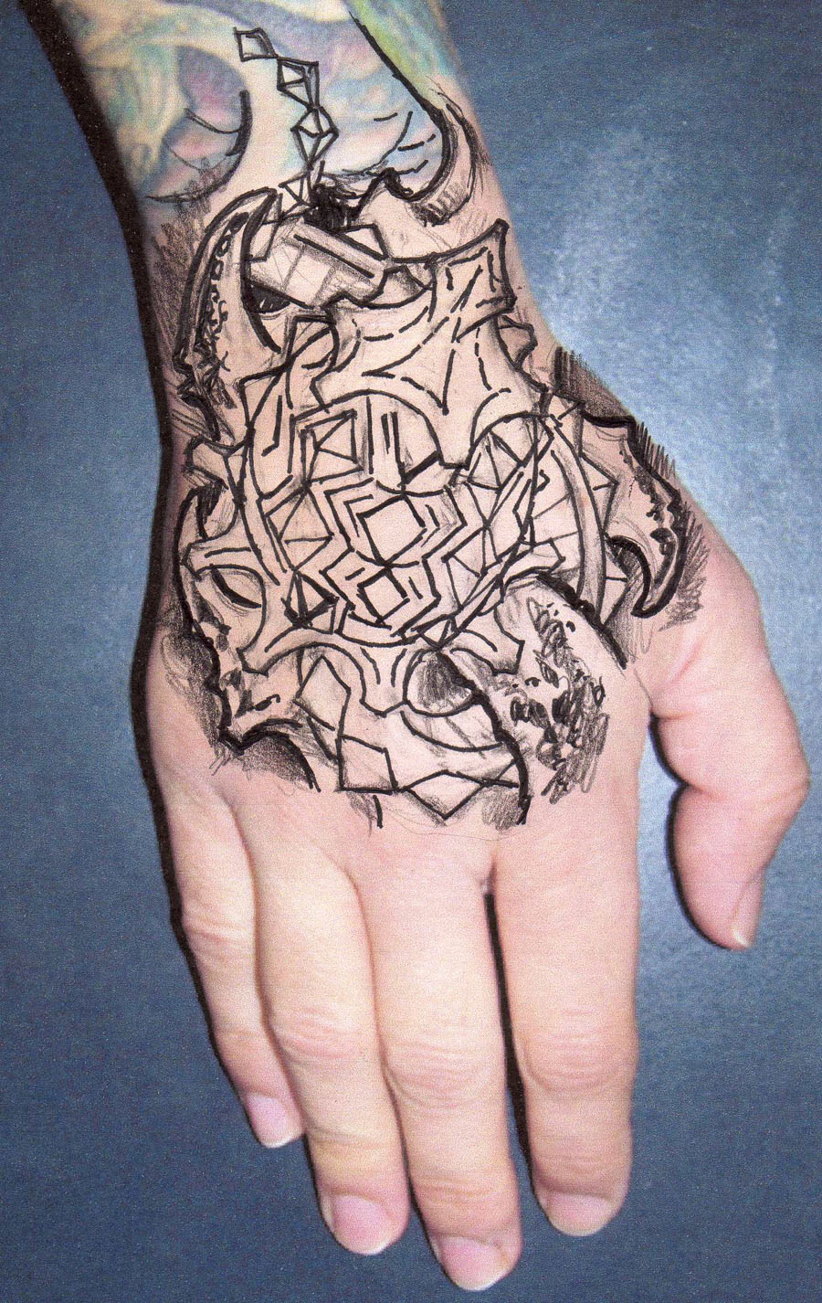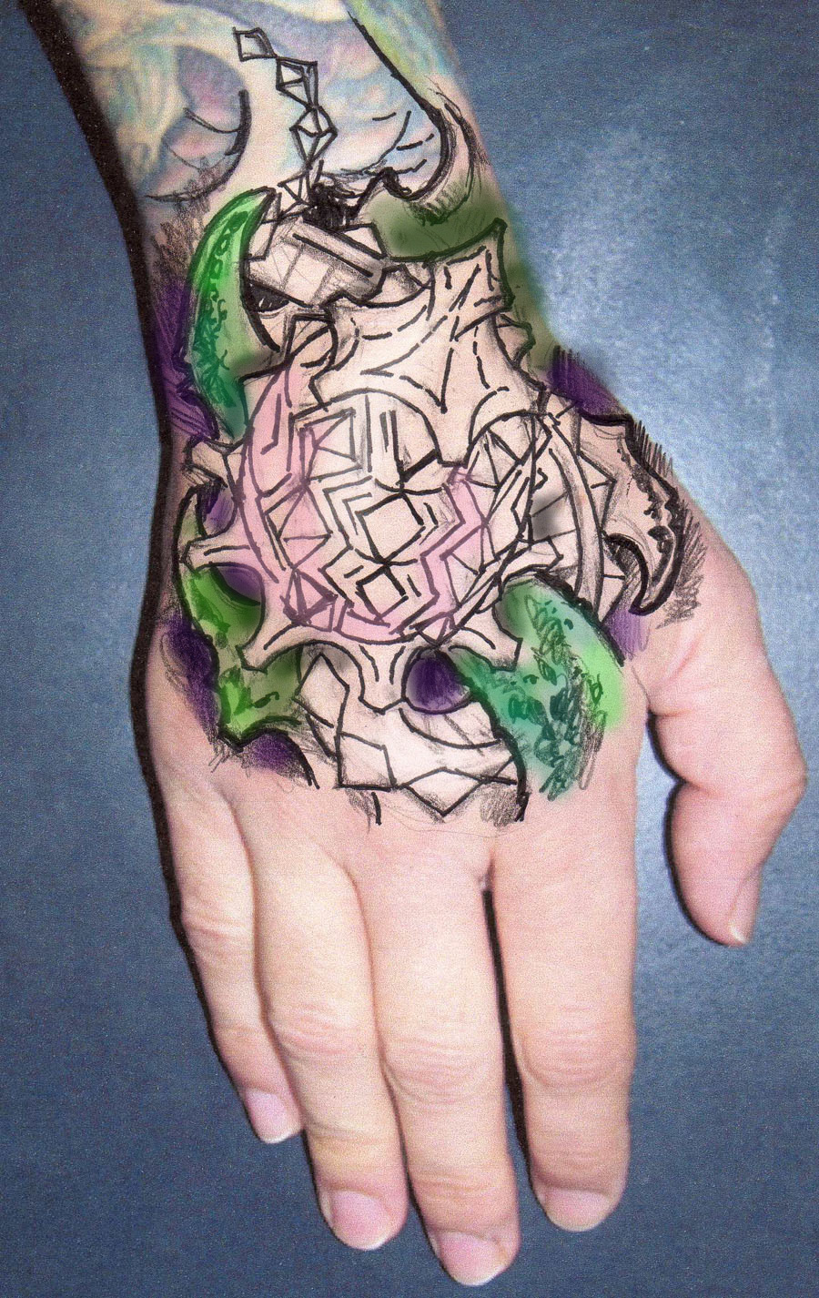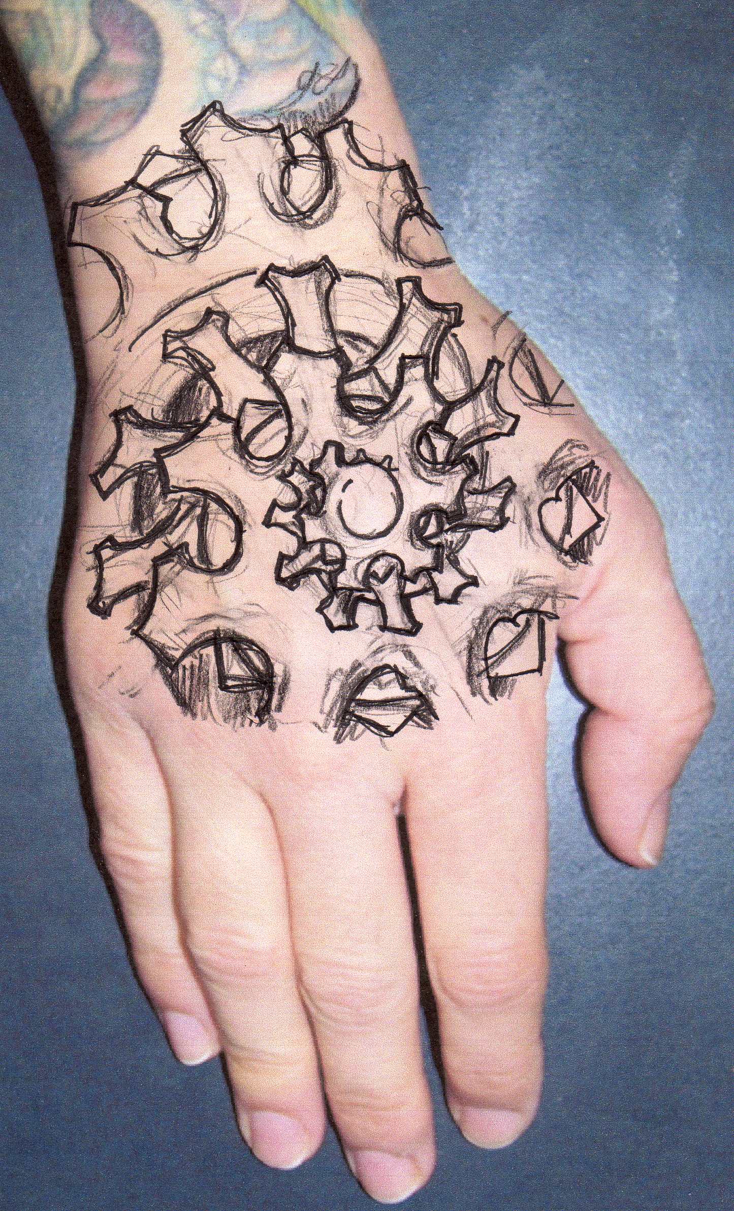 We booked the appointment some time last year as both of us have pretty full schedules and it is difficult to find time that works for both of us. A few weeks before the appointment Don had emailled me and asked what I wanted to have put on my hand. I think that my response was good and vague and somewhere along the lines of – “Maybe one of those hook things with a glowy in the middle of it”. Really I trust him and wanted him to do something that he would have fun with. I wasn’t expecting any further input or conversations on it – just I would see what he had come up with I got there (he had photos of my hand). Much to my surprise the night before I left he sent me some rough sketches…