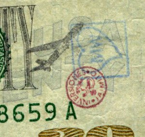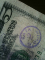 This week I asked the folks at my bank about these – thinking they might be able to offer some insight. Every single one of them said that they had never seen them. I pointed out that the money they had just given me had one in it. Nope, none of them had ever noticed them before. They said that they would start to look for them and ask around to see if anyone else knew anything about them. Interestingly enough all of them did point out that it is illegal to mark money in any way (wasn’t clear on whether that was because they thought I might be contributing to the stamping).