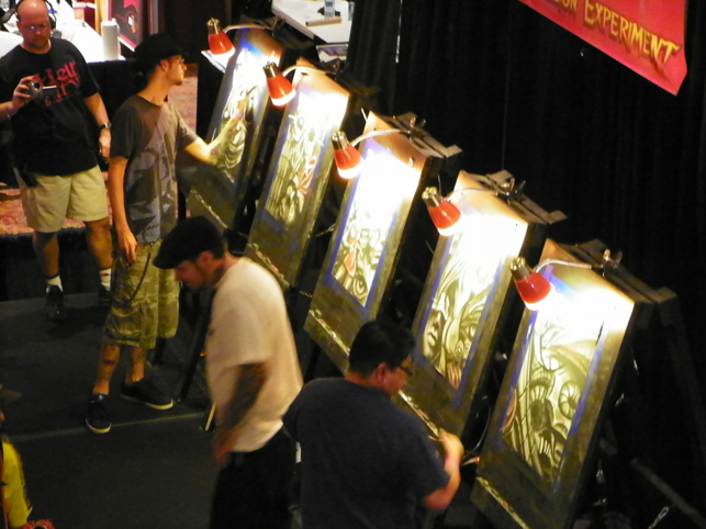 Saturday I didn’t have an appointment until 3 – I thought about picking up something else – but really enjoyed the time to wander around and check out the show and visit. Some conventions I wind up with my head down working in the booth the whole time and don’t get to see what else is going on. This time I got a chance to check out the floor and see what was going on (and get extra hugs from friends). Also peeked over the rail to see what was going on downstairs (we were on the balcony) and saw this going on….