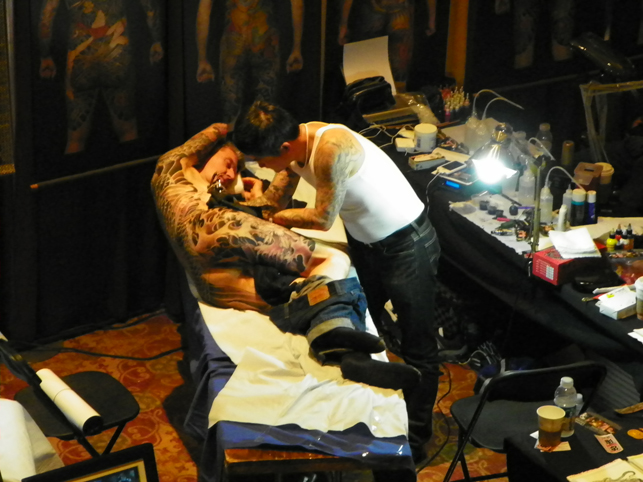 The guy getting the Koi done was apparently started on Thursday before the show opened and they were still working on him Sunday night when people had started to pull down their booths.