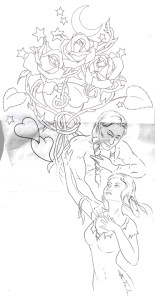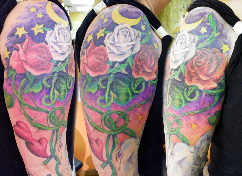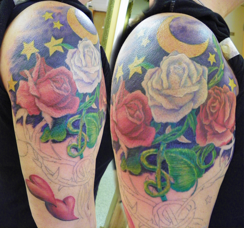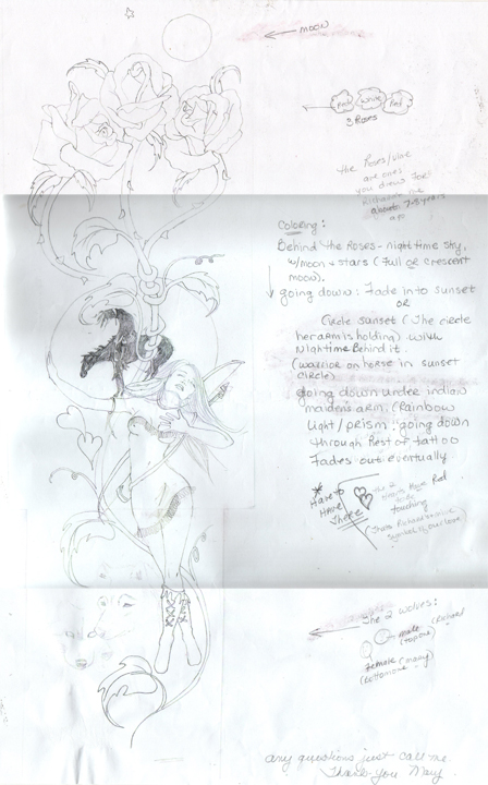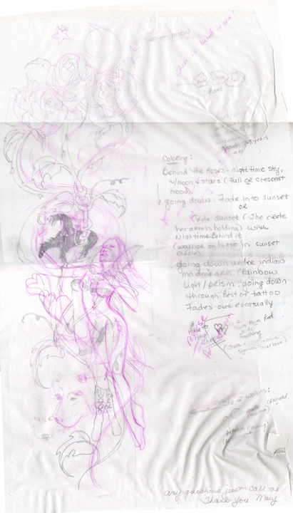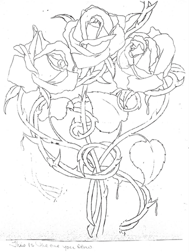 She had some sketches and ideas on what she wanted it to look like. A portion of it was going to be a tattoo of some roses that I had designed for Richard many years prior and that he had never had done.