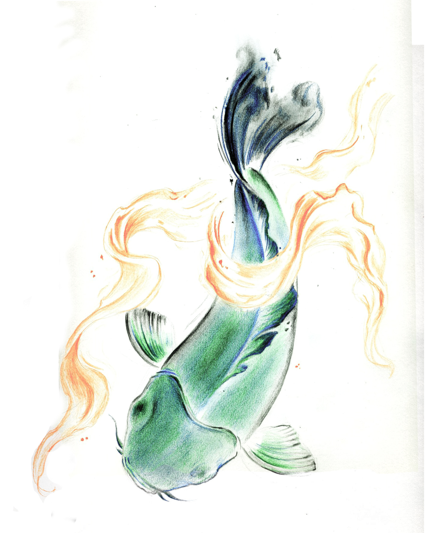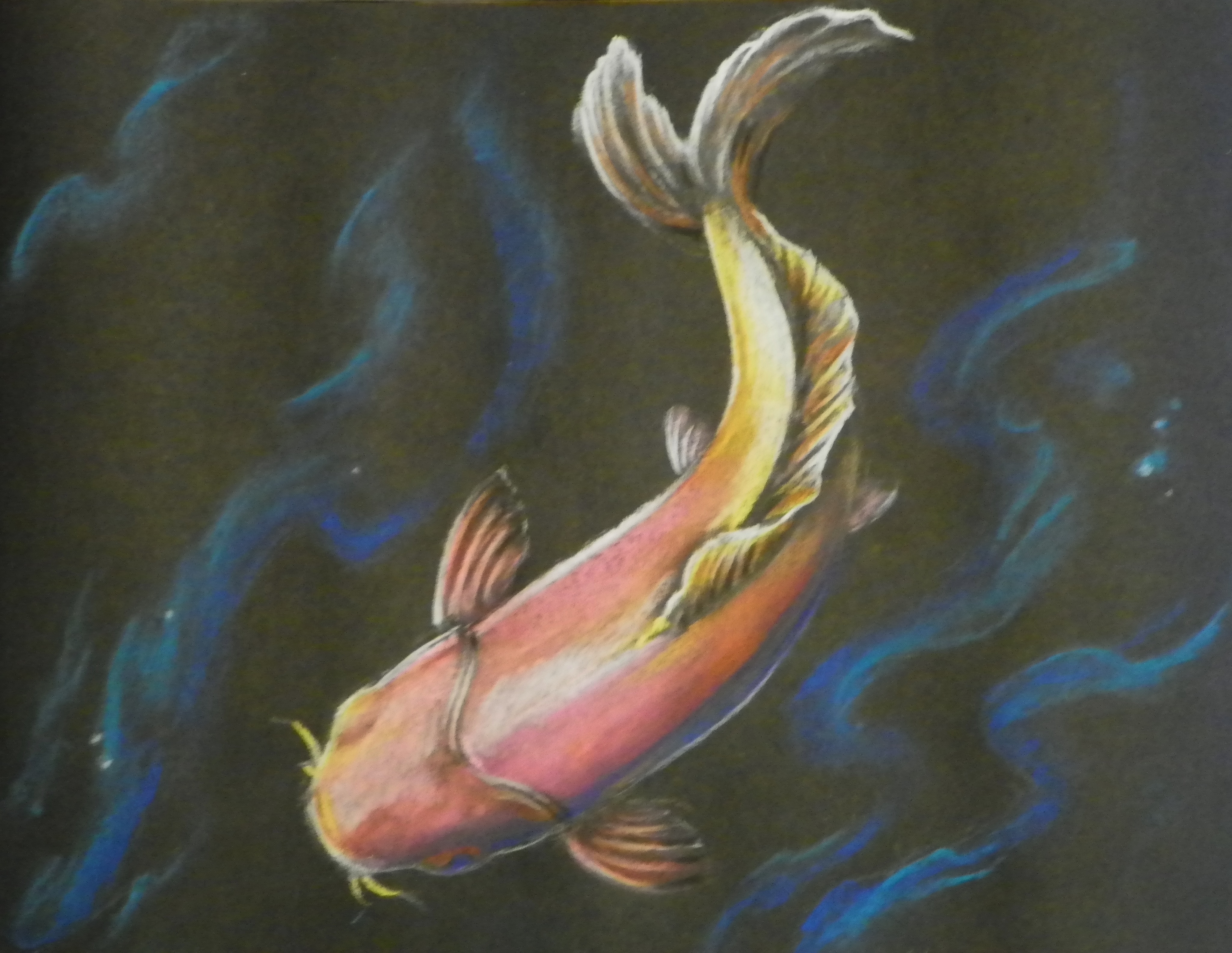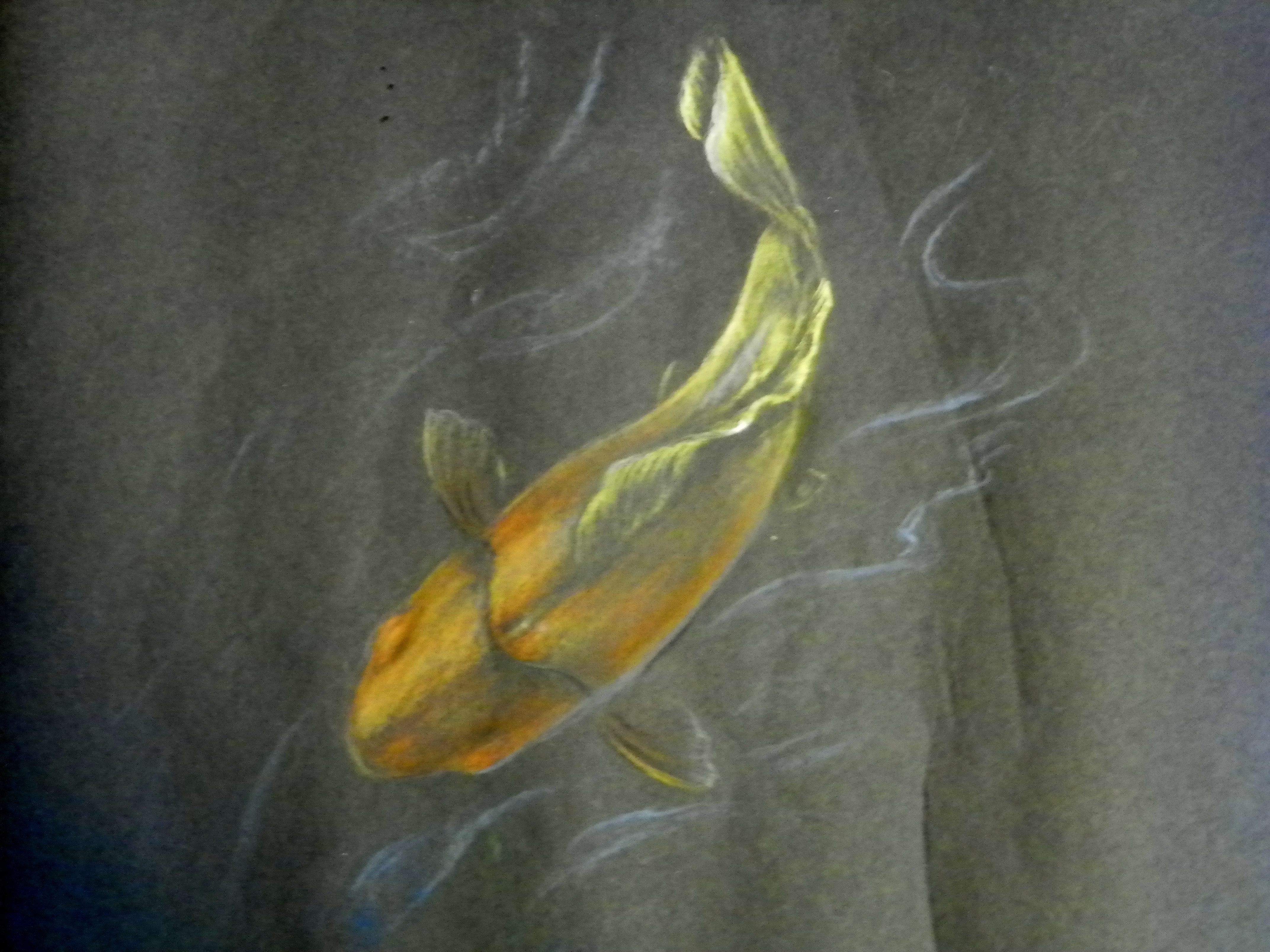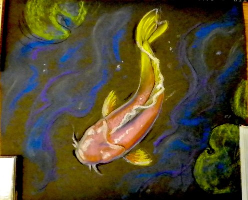 Next I tried some other chalks that I had and the colored charcoals that I had purchased (and never used) for the portrait drawing class that I took recently. I was much happier with the vibrancy of these – but didn’t feel like I had good control over them. Once I stood back and looked at it, I didn’t like the shape of the koi either.