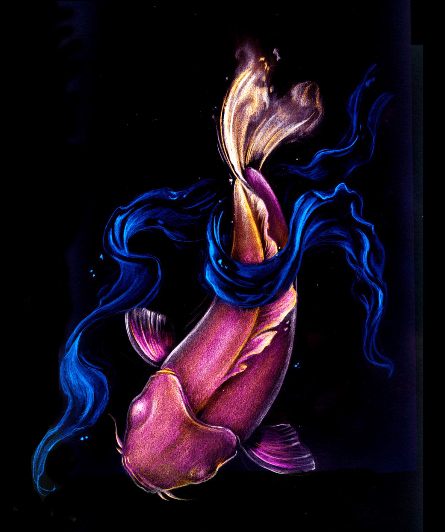 This looked like a koi to me and my idea was to make a koi with the same color and flow as the thing in the picture. I had some pieces of black paper around and started with them. First thing that I tried was sidewalk chalk… but it was pretty light and not really pink.