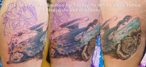 Wednesday I got to tattoo Starr. She told me that I could put whatever I wanted on her. And the best part is that she really meant it! Yay! Dead bird tattoo for TeeJay. Hoping I can talk her into finishing is soon : ) I don’t think it will be difficult – she is a trooper about getting tattooed (unlike me).