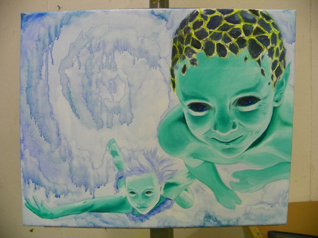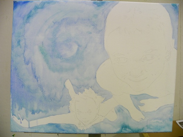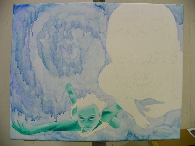 Because I knew that I wanted to experiment with mediums tonight I did a line drawing ahead of time so that I could focus on moving the paint around and not on getting proportions right. Fred did point out that the composition was awkward – but I was actually looking for that. I thought that the whole thing should look uncomfortable and “wrong”. That was what drew me to the reference photo in the first place – the boys arms look totally “off”. I liked it and wanted to build from there.