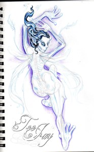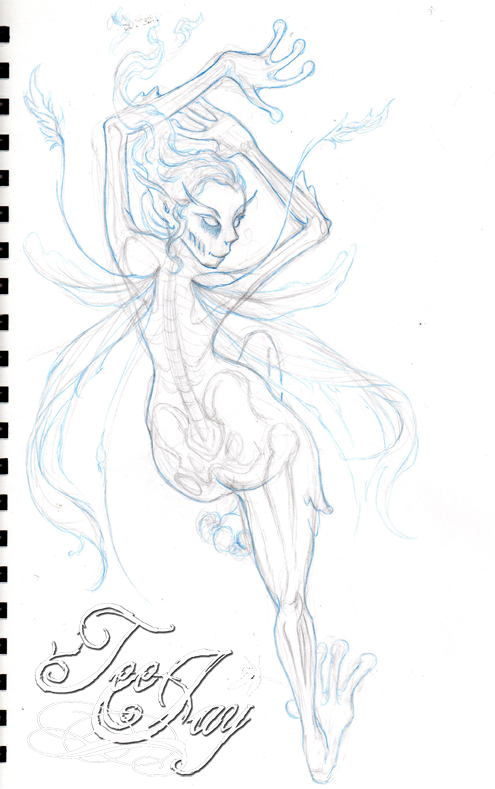so then i started looking at internet pics for inspiration. i eventually ended at the corpse bride. i love the corpse bride, not sure why she never had much of a following. well, she has a couple of ribs, one arm and one leg that are skeletal and the rest are not. kind of cool. so then i thought corpse fairy instead of corpse bride. but i kind of don’t want it to be a like living dead, zombie ish kind of thing. i was thinking more of ‘wow, how fucking cool to see bits of the functional anatomy of this really cool creature. then i thought about jellyfish.