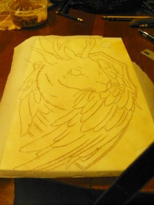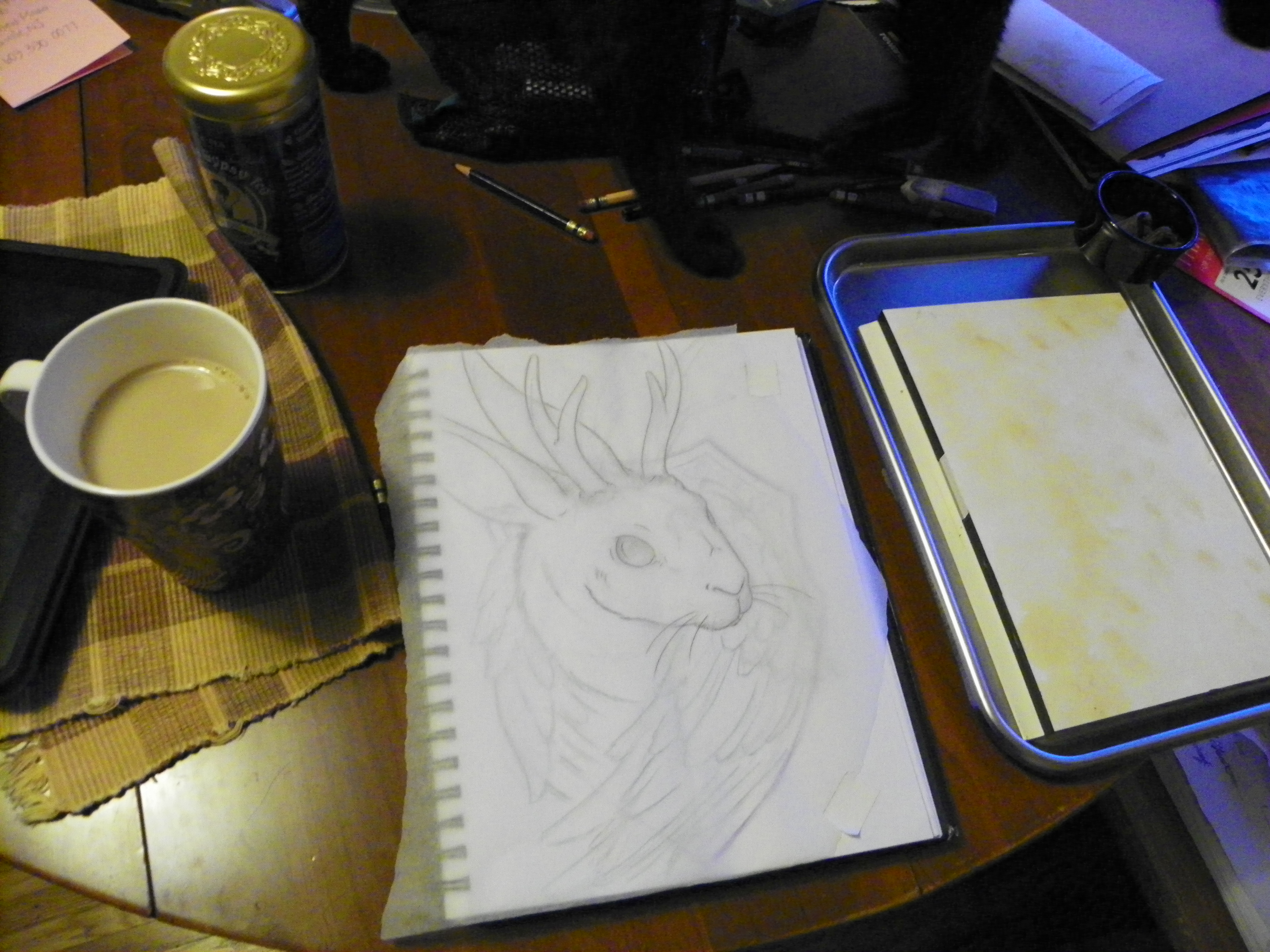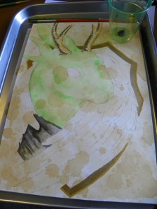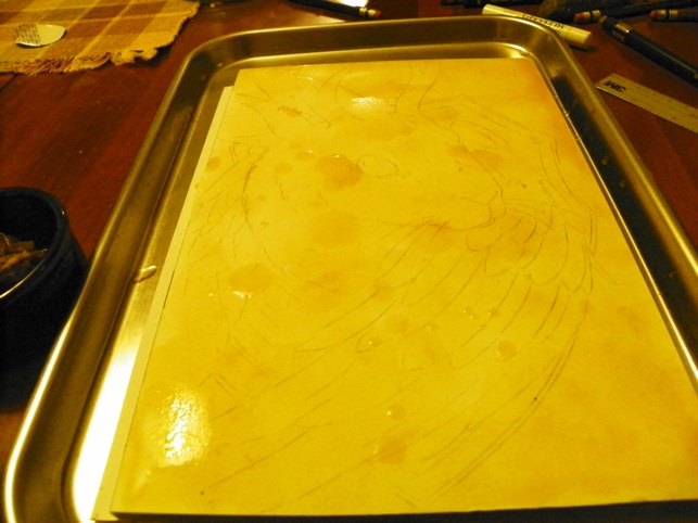 At this point in the process I got frustrated with waiting for the layers of tea to dry. It was late and so I didn’t want to take a hair dryer to it and wake anyone else up in the house. Jessie told me if I was bored, I should draw on her for a while… so we went and watched “Better Off Dead”, I drew on her and waited until morning to get back to the watercolors.