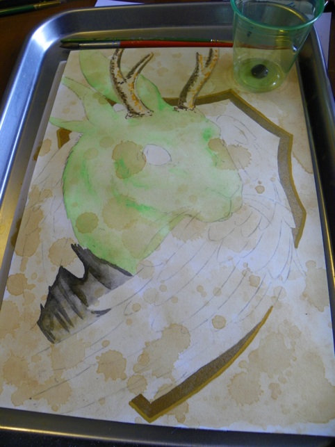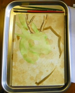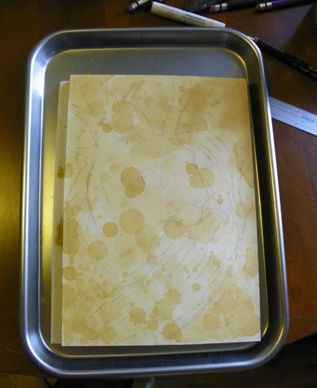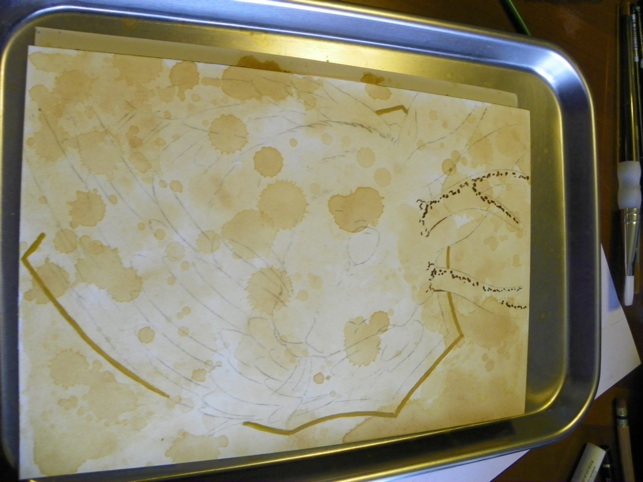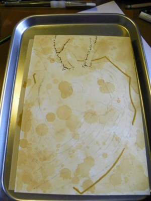 I had fun, but don’t have any plans at all to do anything else with watercolors for a while. Antiquing the paper was by far the best part.
