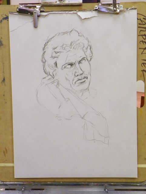 conte sketch Steve recommended using the charcoal instead (which we all know how much I like). But since I am trying to learn – I gave it a try. He let me use the Coates Willow charcoal that he has at the studio and I liked it much better than any of the charcoals I tried in the past. charcoal sketch I suspected that this one was still too big – so I started another one.  Pat way in I realized the angle of the head was wrong… tried to erase it and correct it and decided that newsprint is really not the best surface for attempting that on. another charcoal sketch Happier with the proportions on the this one I started building up more details. Steve came by and helped point out some of the shadow definition – so this next one is some of both of us drawing. more finished charcoal drawing We tightened this one up a bit further and sprayed it with fixatif. fixed charcoal drawing The next step was to redraw the basic image on the back (with a light table) to prepare to transfer it to the canvas. reversed charcoal drawing This was taped in place on the canvas. charcoal drawing taped to canvas and then traced over with a pencil to transfer it to the canvas. transferred to canvas I am figuring the next step will be to fixatif that and start the painting – but that was as far as I made it today. A decent start for being “unprepared for class” as I was. (I did have all my painting stuff with me – just not all the drawing stuff that I needed).