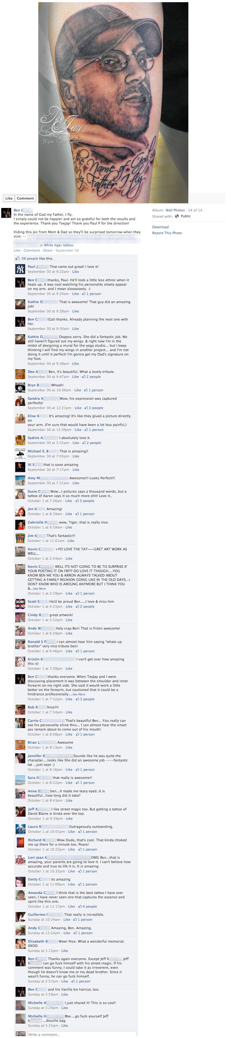 Due to the magic of the internet I was able to vicariously view some family and friend reactions to Ben’s tattoo through his posting on facebook. It was an amazing experience and I wanted to share it with you.
