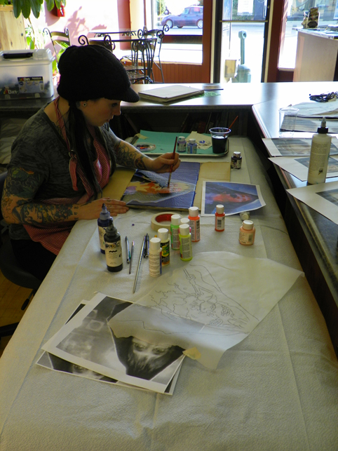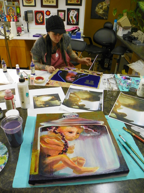 I got through the bulk of them and was talking with Sara about some paintings that she wanted to do with black light reactive paint (for a group show she is involved in). It came up that she did not have any acrylic medium with her at the shop so I offered to go and grab some from my house for her.