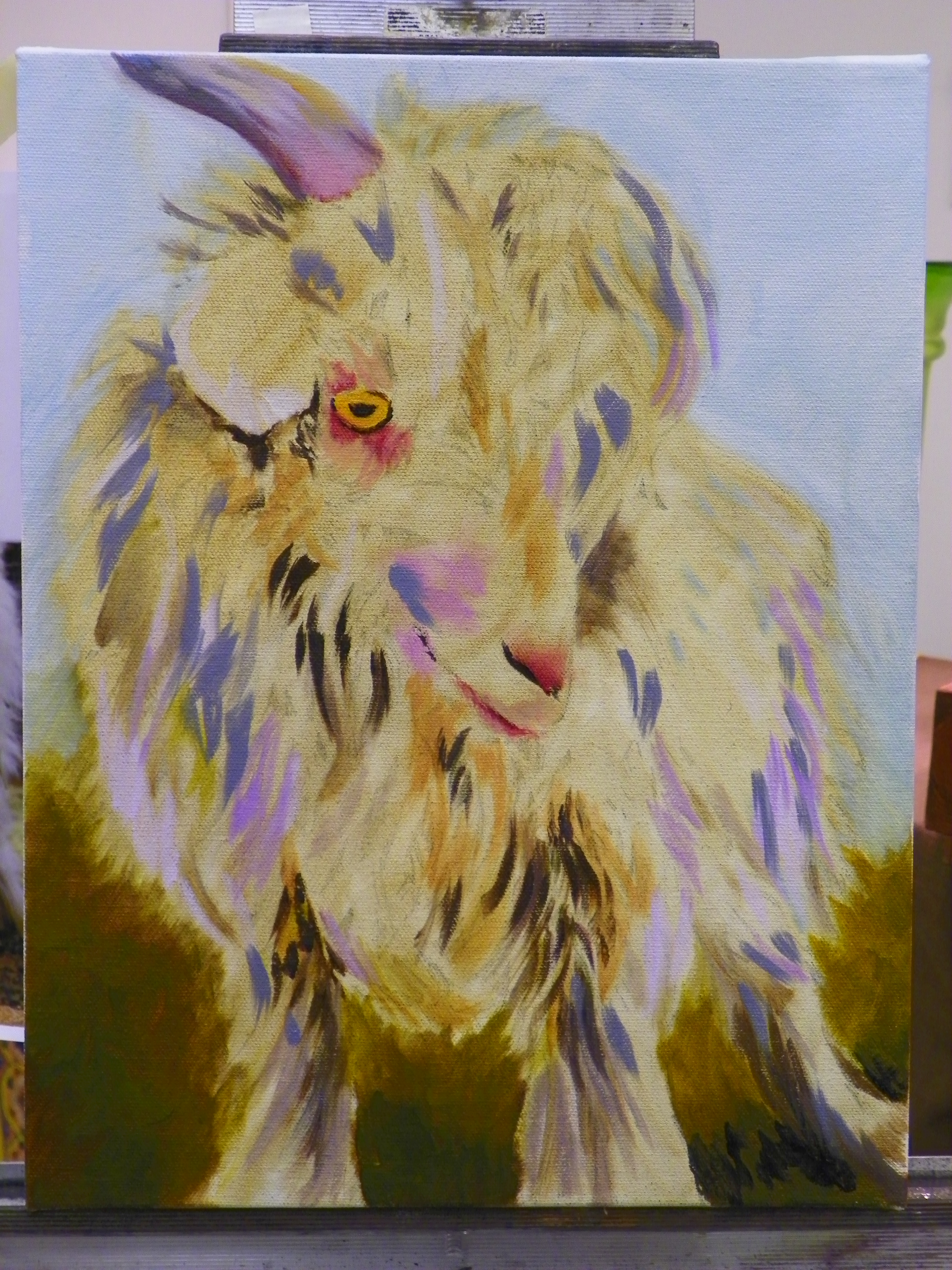 I brought the other paintings back home (the hand, the seal and the goat) and worked on the goat for a little while longer this after noon.