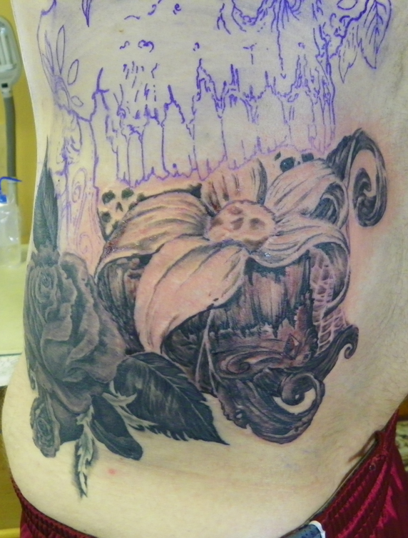 I also did a little more work on Frank’s skull. He was sick. I was sick. It worked out just fine that neither of us was up for a marathon session. In these photos the rose and leaves are healed. In some of the pictures you can see the tints from the Silverback colored blacks. The rose is done with the “Fresh” and the leaves have the “Mold” in them.