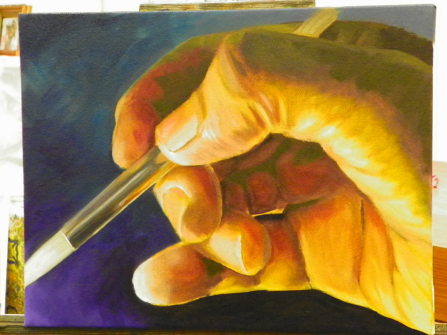 This morning I went to painting class. I decided to work on the hand until Steve had time to stop by. I only had time to work on the background.