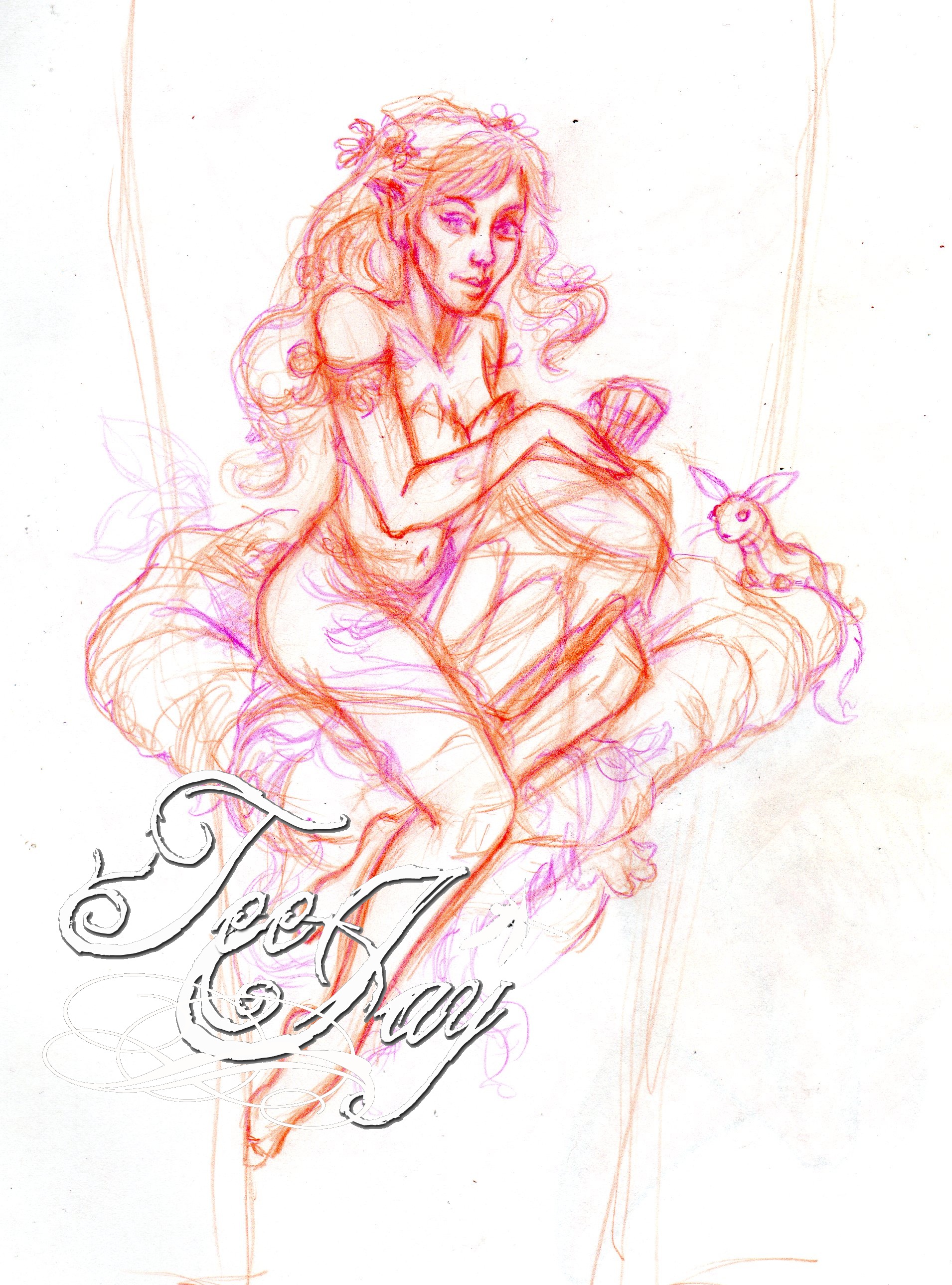 So the first thing to do was to sketch out an oblong area that the nymph would fit well within. I also found out that there is a fungus that is called a Dryad’s Saddle which is indigenous to this area (Sarah spends a lot of time outside and of course knew this before the internet told me) and decided that would be the best choice for the mushroom.
