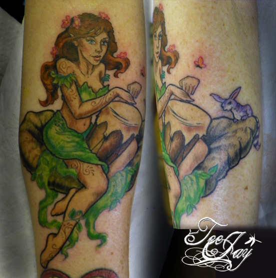 Normally when I do these “Progression of a Design” blogs it is about showing the client’s original concept and where we went with it from there. Since I have been tattooing Sarah for a while and we have a good working relationship she had told me only that she wanted a woodland nymph sitting on a mushroom playing the drums.
