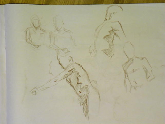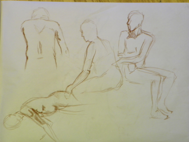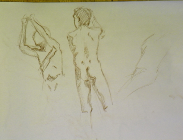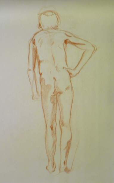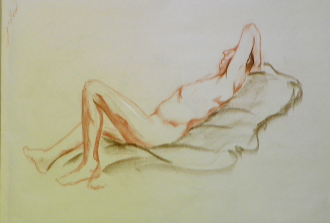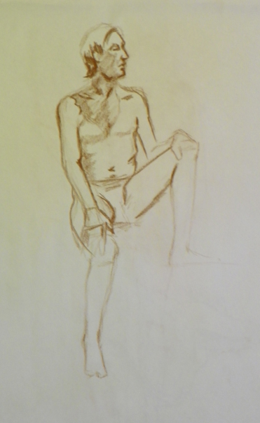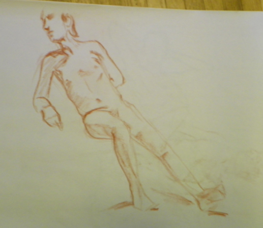 And of course then on Monday we have the figure drawing stuff. This week we had a model who had never posed before so there was much confusion. One of the other students let me borrow a Derwent charcoal pencil for one of the poses and I liked it. I’ll have to see if I can find them. (Gretchen if you are out there today – you might like them also. Much better control and if you sharpen it to a chisel point you can get some neat effects)