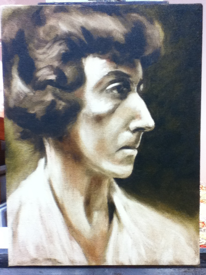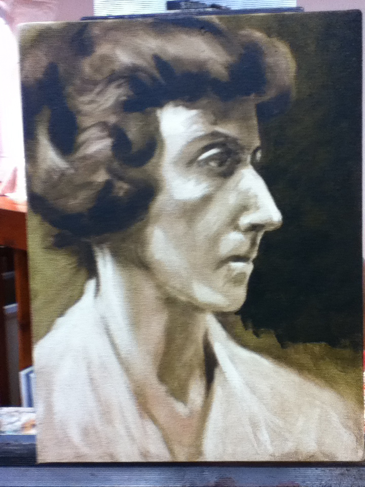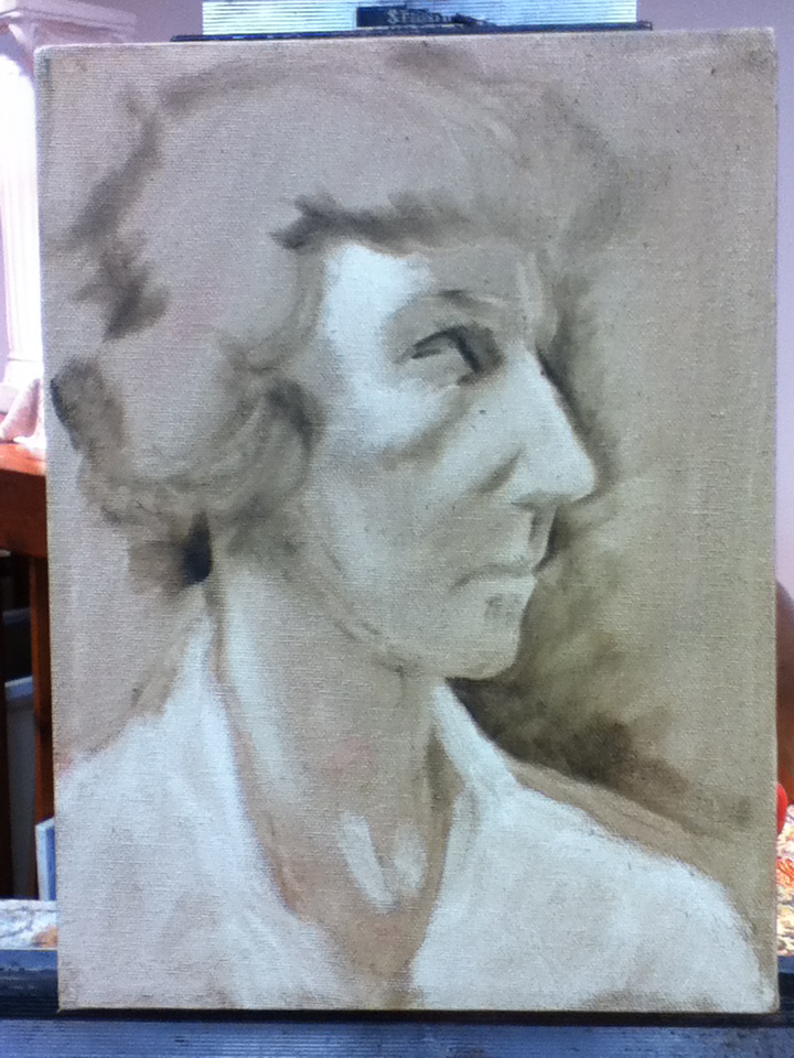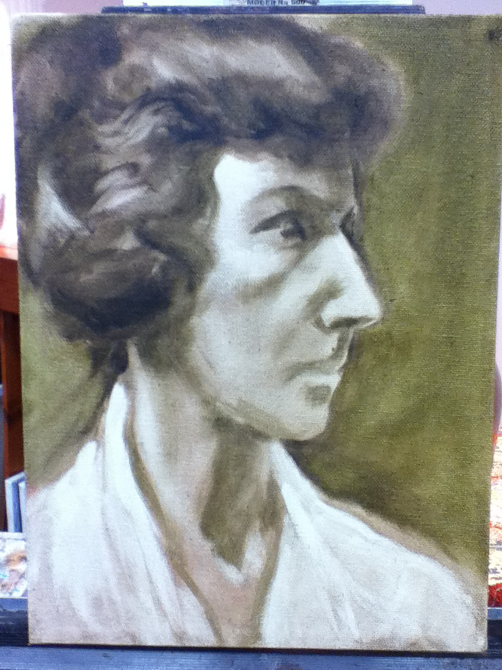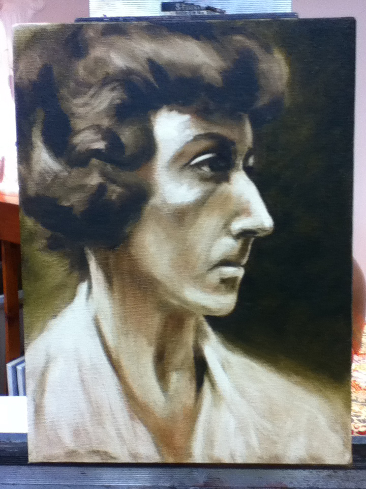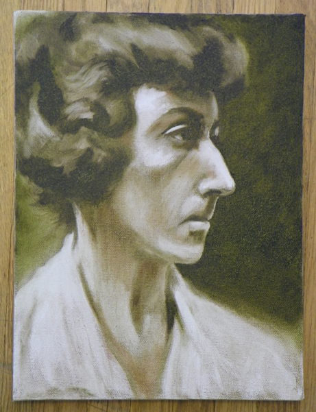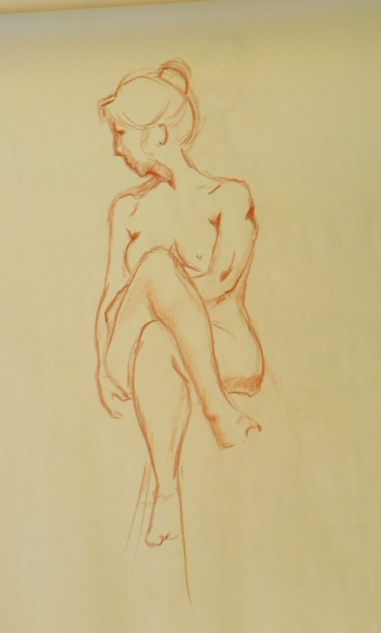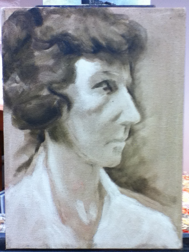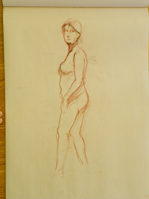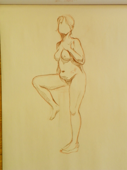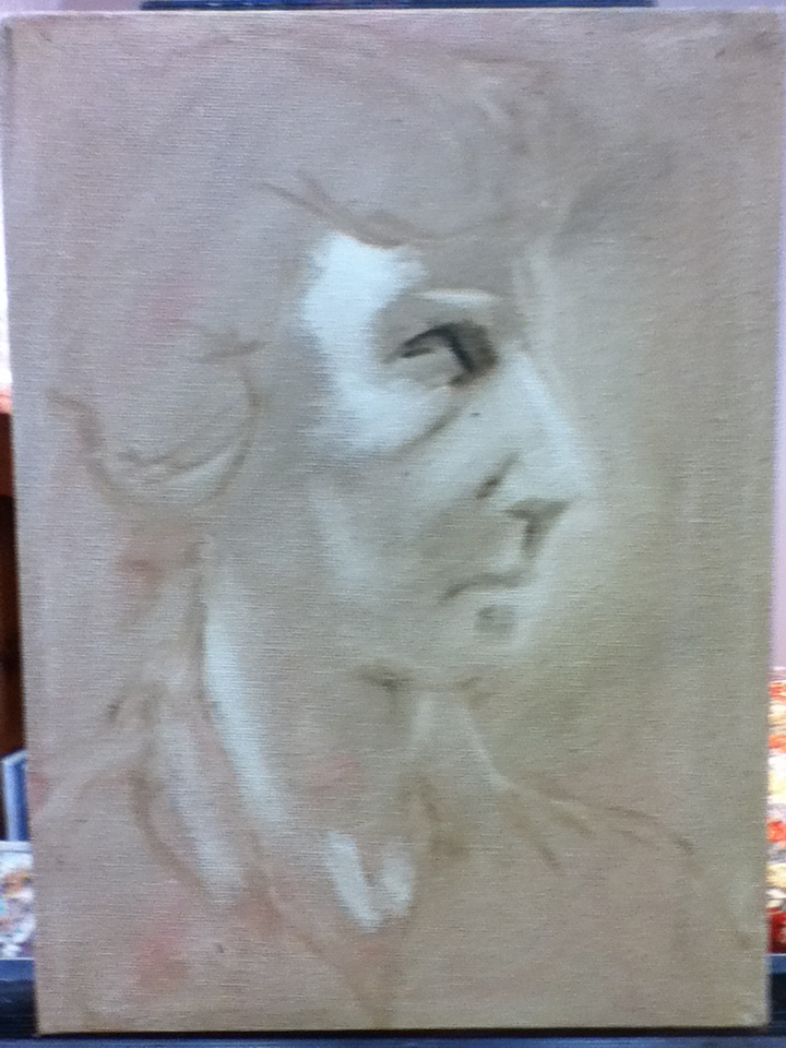And then my first attempt at painting a figure from life. I took the sketch that I made last week and transferred it to canvas and painted in class. Not really please with the colors again. I am definitely having a hard time translating skin tones from skin to canvas. I am used to all of the warm tones being there (on the skin) and having to primarily focus on tonal range. Mixing colors is going to be a challenge for me if I am going to try to render things realistically.