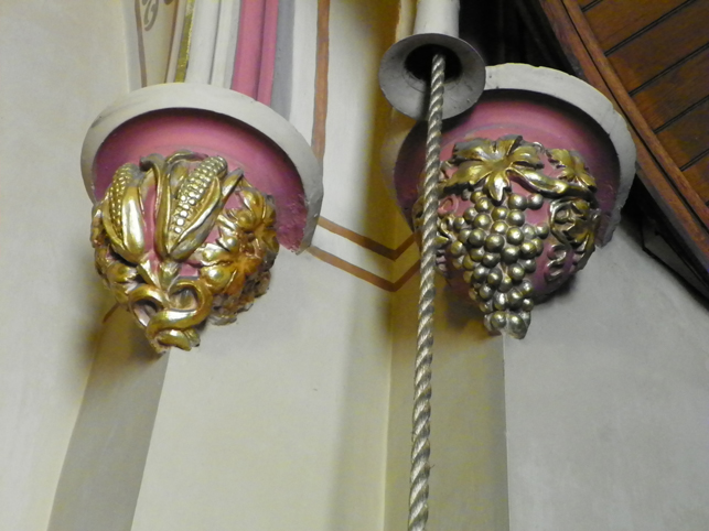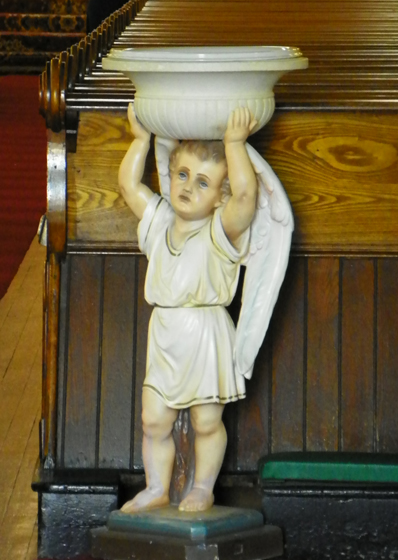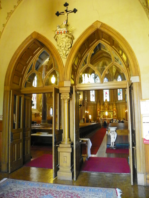 inside front entrance   interior door way St Michaels   cherub holding up Holy Water   pull rope for bells in tower   interior of St Michaels church   front entrance ceiling   spiral staircase   St Francis   stained glass   south side interior    panoramic interior of St Michaels   That’s Tom <— in the left hand side of this photo.