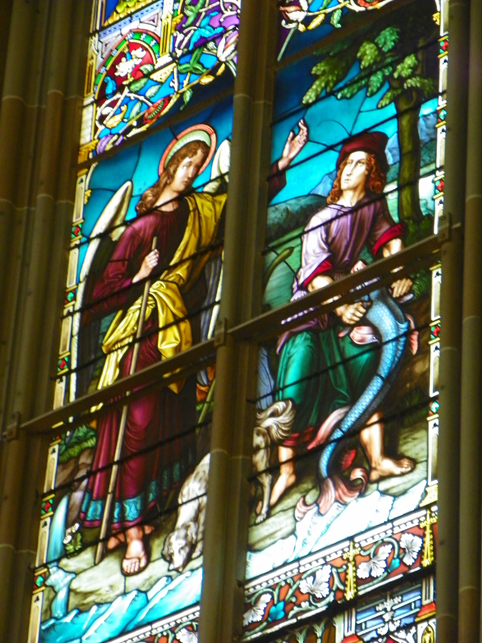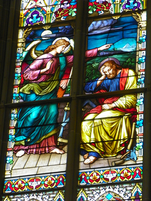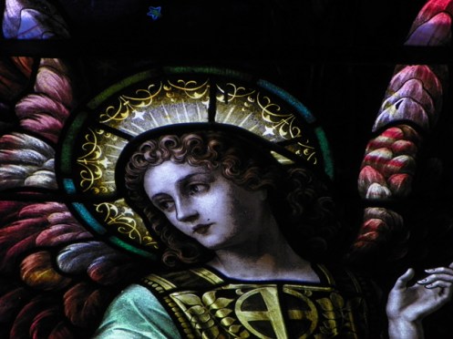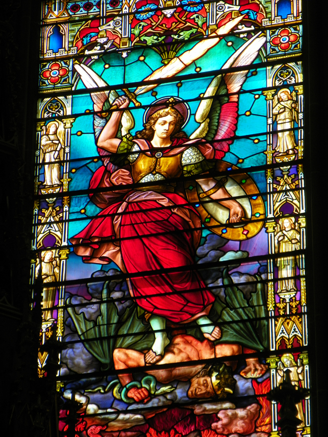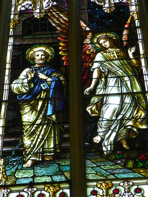 doorway   altar at St Michaels   altar at St Michaels   This window is unique for a couple of reasons. Firstly it is the only window in the church that does not include an angel. Besides that it is also the only window in the church to have ever been broken. At some point there was a small fire and the Firemen had to break through a portion of the Stained Glass in order to get the hose through. The folks who made the windows originally (I am hoping someone remembers who that was as I would like to research them further as well) were able to match the pattern exactly from their records. Because of age and dye lots they were not able to exactly match the colors which is why the cloak color varies from one panel to the other. repaired window      pulpit