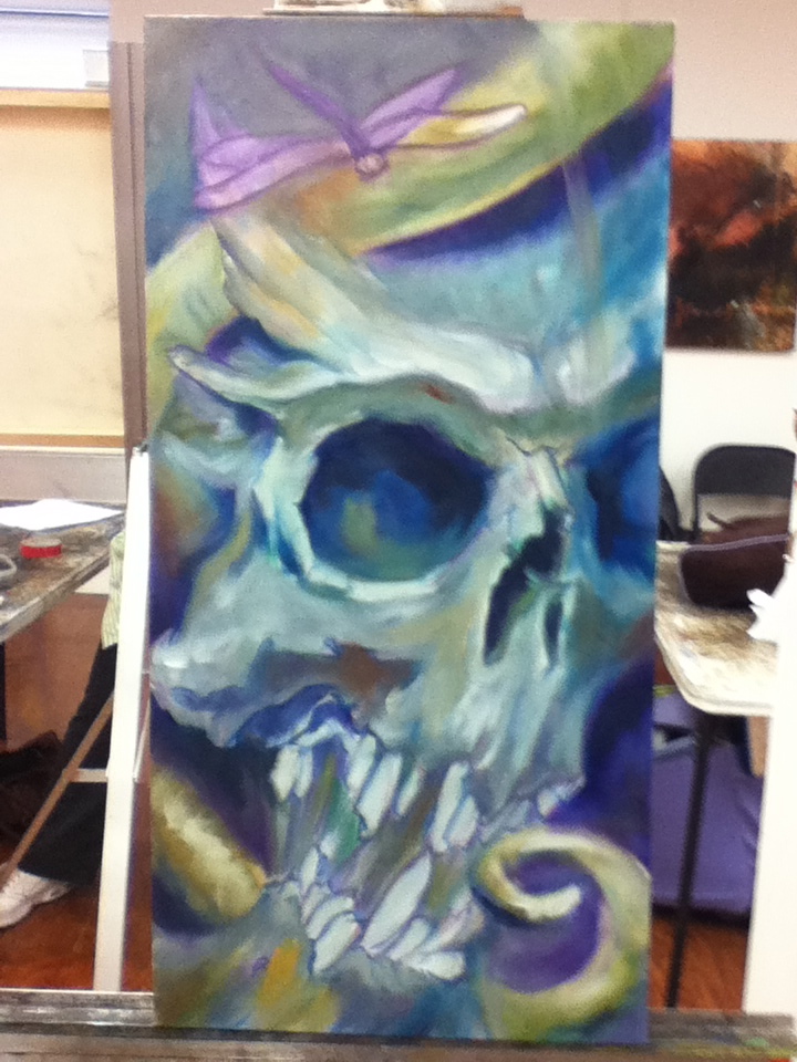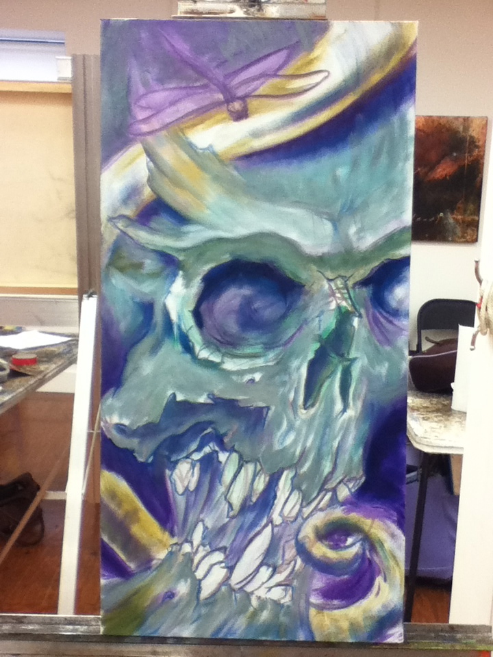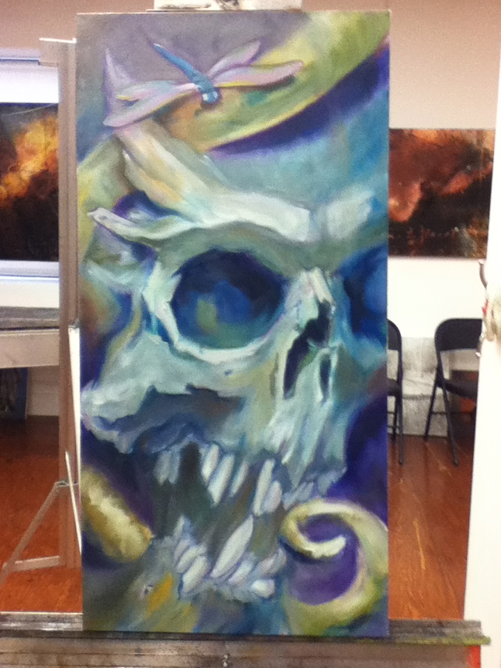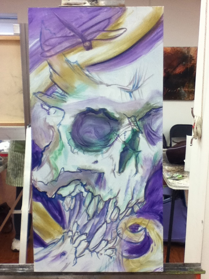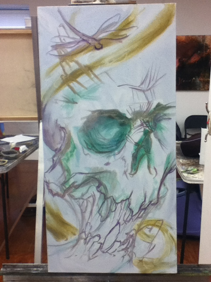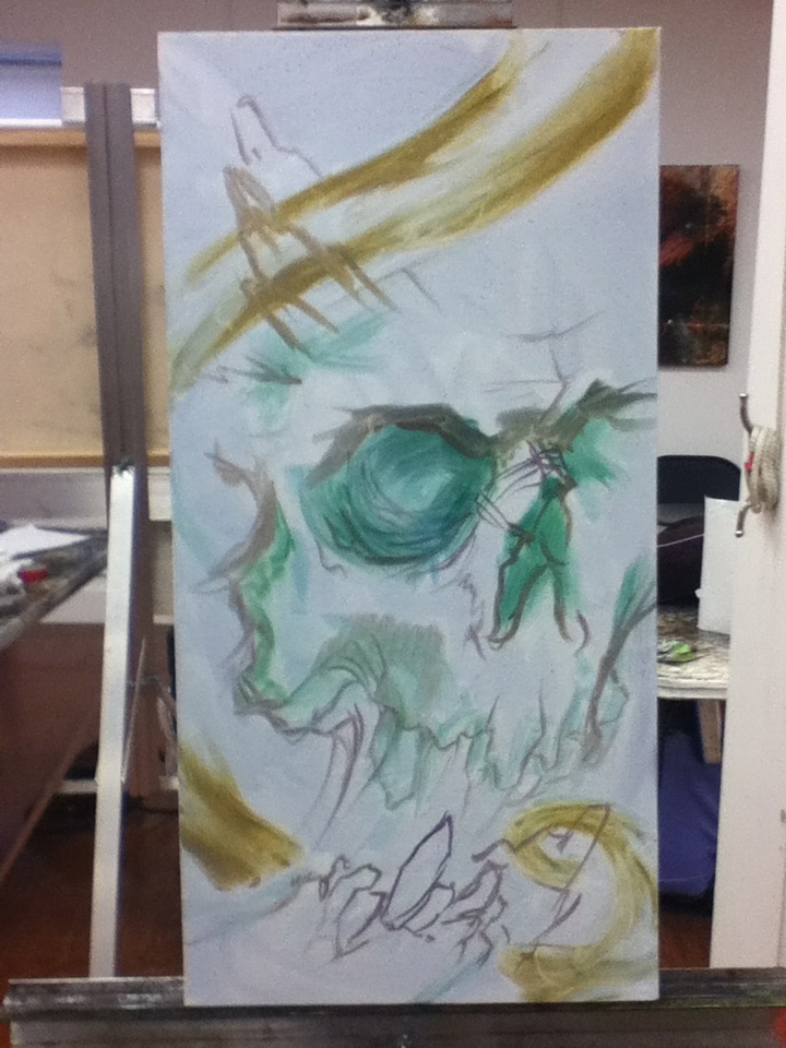Since I wouldn’t want to waste part of class I bought another canvas off of Steve to start. No idea what to work on and no reference with me printed out. So default to skull. Easy, right? Nope. Never easy. But at least this time it was fun.