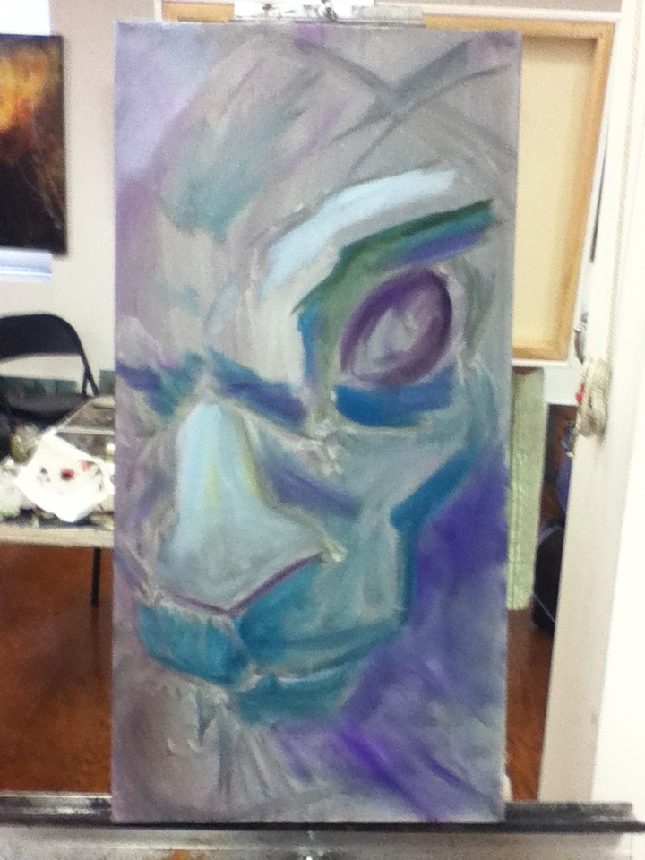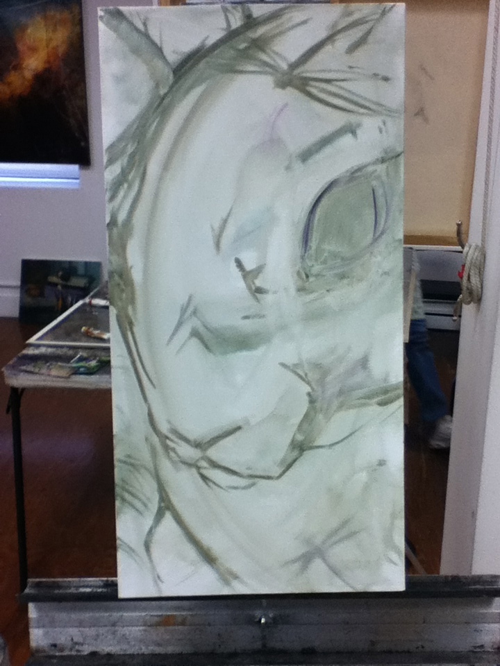bunny painting struggles   where is this going?   oh you bunny   wiping it all away   and finding it again   rabbit forms   building a better bunny   here comes the wabbit   form of a ....   getting there Now that I am looking at this I realize that I did a tiny bit more after this last photo. Nothing earth shattering.