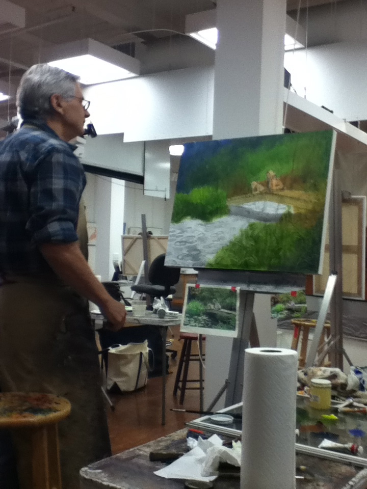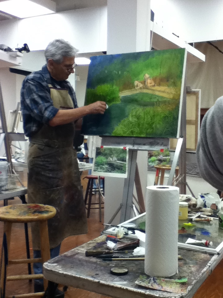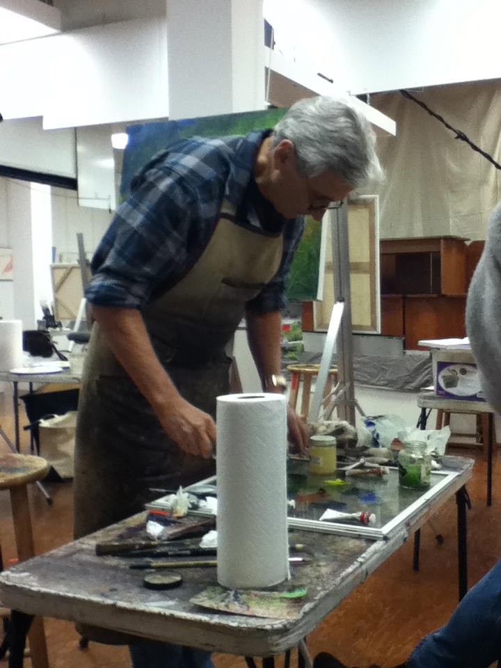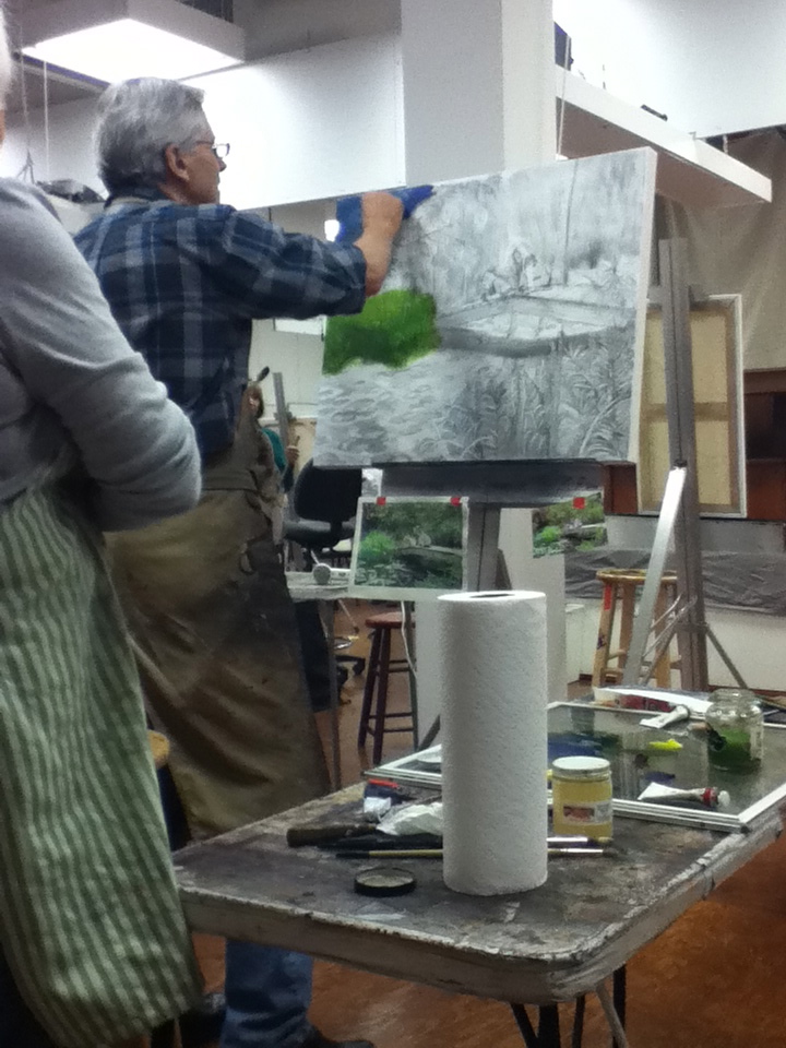 • It is a class and Steve will often demonstrate techniques directly on a student’s work. He is very courteous about it and asks before he does it. Including to what extend the student is comfortable with him working on their piece. The first painting that I did in his class he painted on quite a bit. I don’t think he has painted on any of them since. I am sure that there are some students who go home and lay claim to having done the work all by themselves – as for me, I didn’t sign the piece that he worked on as I don’t feel that it is really mine. It also was an exercise in learning a new technique for me and I found it very beneficial to have him explain and demonstrate for me.