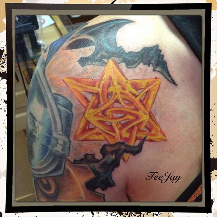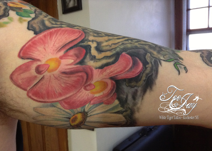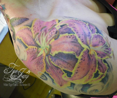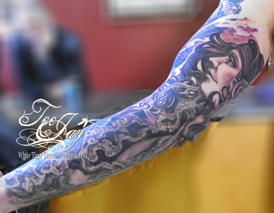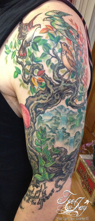 Saturday I added a shoulder piece to the Sleeve that I made for John. Yet another great client. Super fortunate that everyone I worked on this week was so awesome. It was hard to come back to Rochester and leave my kid behind in North Carolina – but the amazing people that trust me to decorate them make it much easier. I was also able to grab some healed photos of his other half sleeve now that it is healed. I am hoping to have him stop by some day when it is daylight so that I can get some better photos of both of them healed. John is all finished for the time being at least. It was great getting to know him a little bit and I hope he enjoyed the process as well.