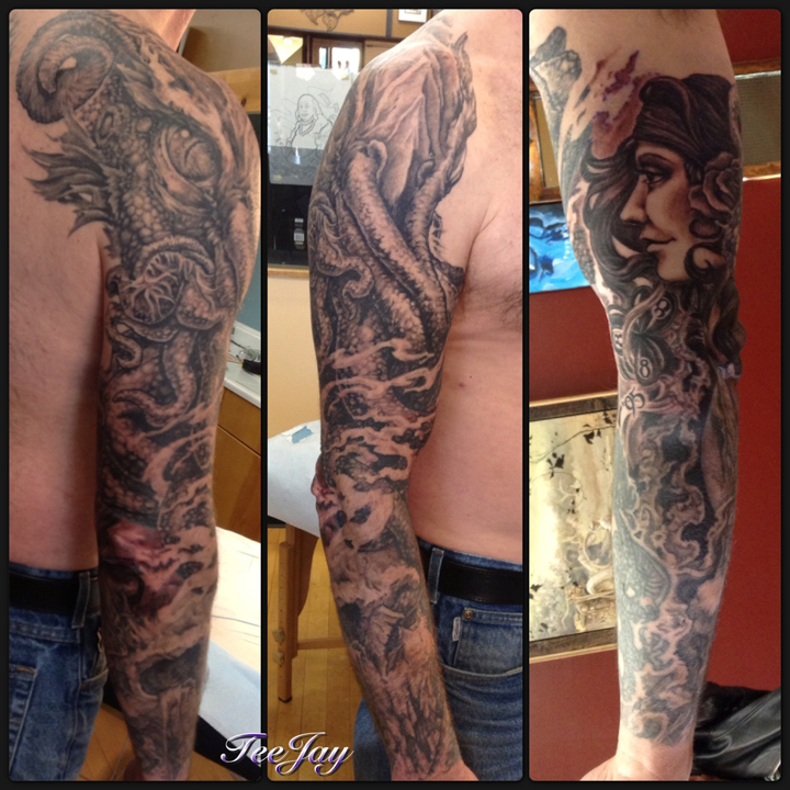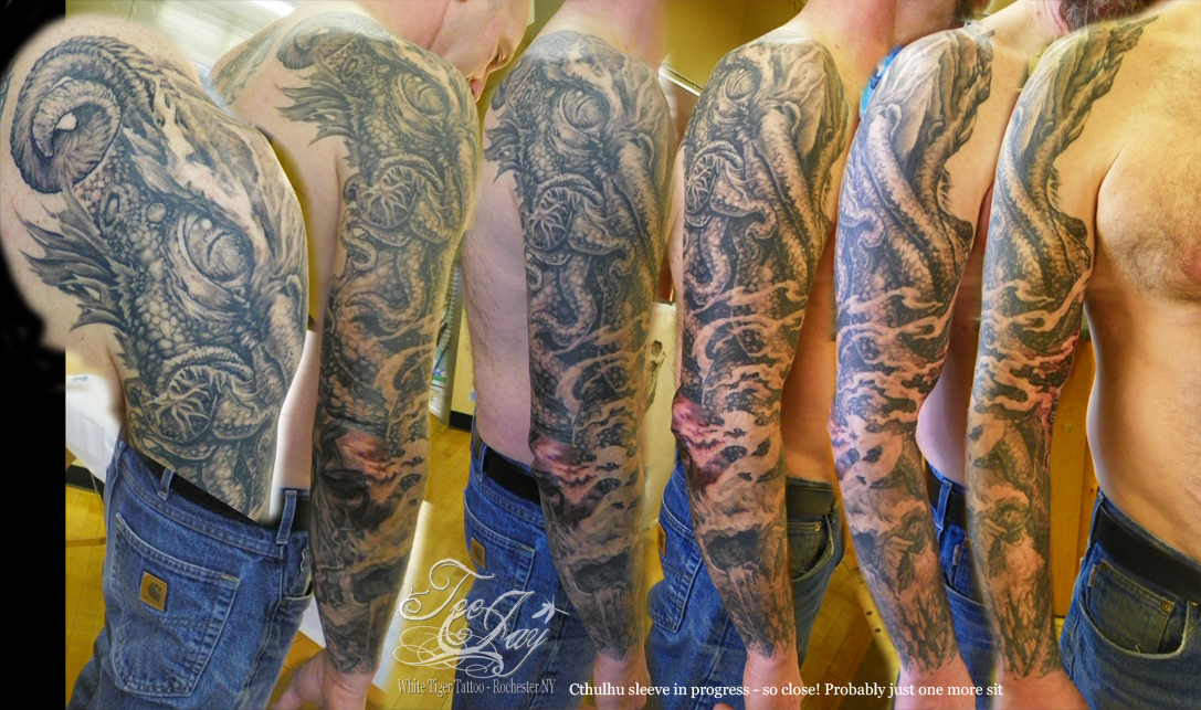 The Cthulhu sleeve is just about finished – want to add the horn on the other side of the head and fill in a little bit of back ground (can I fit more skulls in there?). I’m really happy with this one and Bob is great fun to visit with while we are working. This session we had a whole long discussion about “back in the day” dive bars in Rochester.