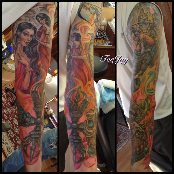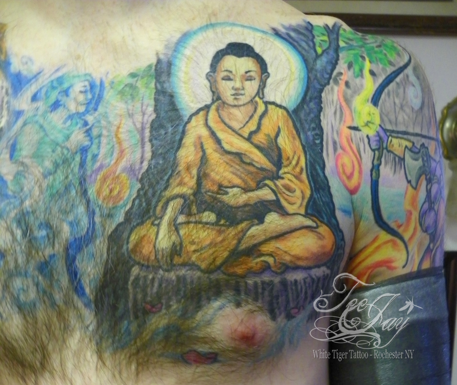 Eric is finished with the sleeve portion of this Buddha/Mara piece. I may need to go in for some touch ups, but not much at all. Next we will work below Buddha to bring the piece a little lower on his torso and add one or two more antagonists to the scene. Eric is also a great client and a few of us at the shop look forward to his visits. I’m excited about this tattoo and also a little bit sad that it will be finished soon. Hopefully Eric will let me make something else for him in the future.