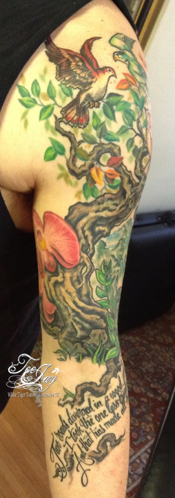 I have been tattooing a “forest” on my friend Michelle. Michelle and I have been friends since High School (and she still likes me!) This was the latest addition. She had asked for a dancing willow tree – feminine and brightly colored.
