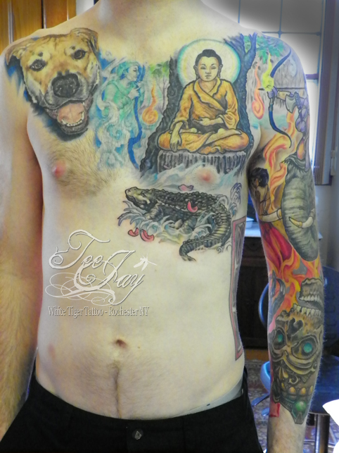 We have added what will be the last piece to Eric’s Buddha/Mara tattoo. I’m a little sad that this one is going to be finished soon as I have enjoyed working on it immensely. There is one more session to go to finish the MarshCroc and possibly some tightening if Eric has found anything that needs it (or I come across anything).