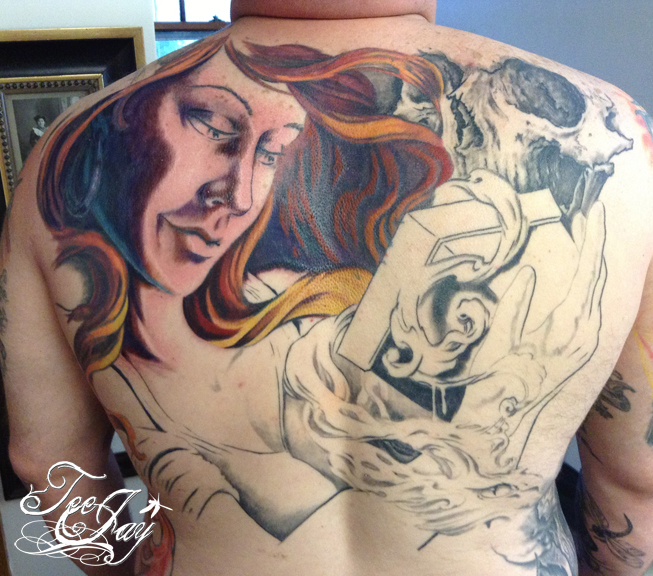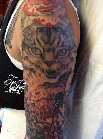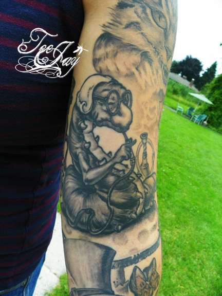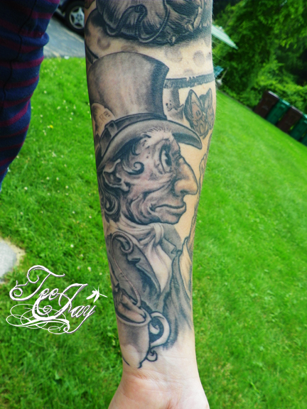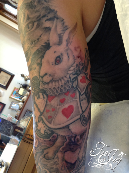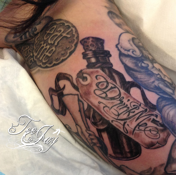 Tattooed a little more on Mariah’s Alice in Wonderland sleeve (adding “Drink Me” to the already healed “Eat Me”).