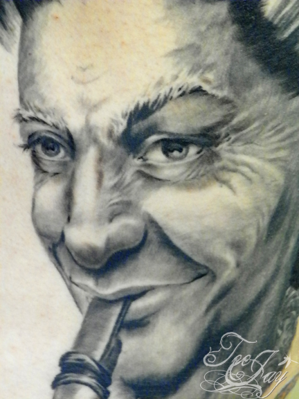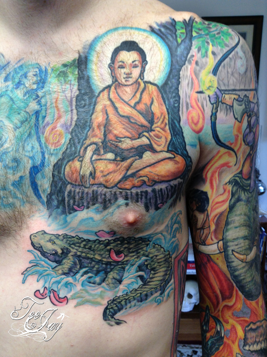 Put the last piece in place on Eric’s Buddha/Mara tattoo/sleeve. I can not tell you how much I enjoyed working on this tattoo. I learned a lot and got to hang out with a really nice guy (thanks Eric!). He takes really good care of his tattoos both while they are healing and in protecting them from the sun so I know this tattoo will look good for always. We will get together soon to get healed photos of this as well.