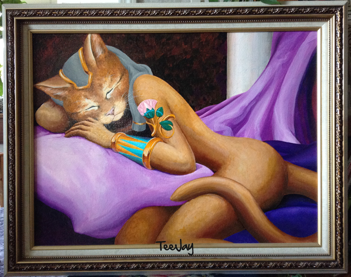 Sunday I went to the zoo in Buffalo (as mentioned in my previous post) with some friends. They also took home one of my favorite older paintings. Bast is going to live with them from now on. I’m sad to see her go, but I really have too many paintings at home and I’m still making more – so room has to be made. I know she will be very happy living with Frank and Bec and maybe I will even get to visit her now and again.