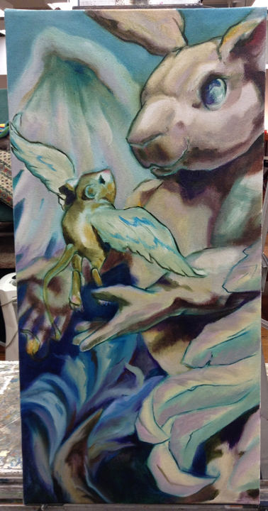 Monday I was back to painting class. While I am once again struggling with the Flying Lessons painting – I am confident that I will win out this time and the problems with it can be corrected. Bunny nose definitely needs to change again though.