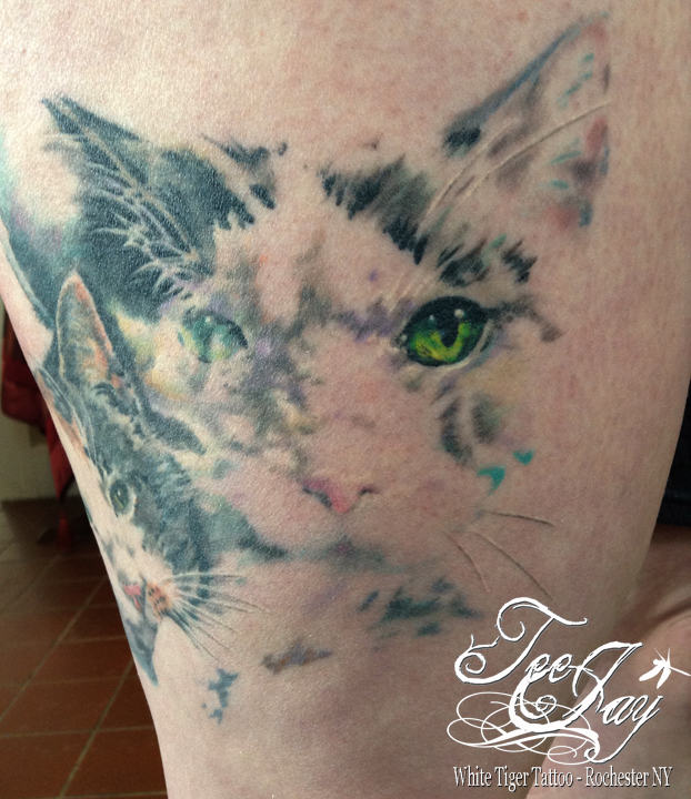 Jenn was nice enough to stop in so that I could take photos of her double-exposed kitties (the reference photo was double exposed) and since I was tattooing Jesse (Counter Volunteer Extraordinaire) took some for me. Thanks ladies!