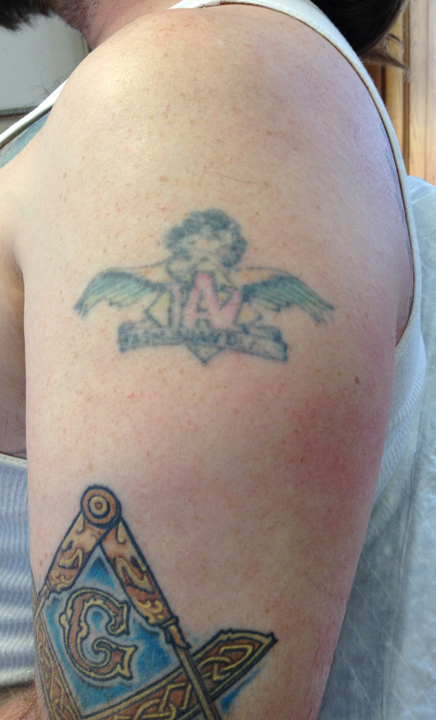 Working on this cover-up of Taz on Paul. Again there are a lot of things going on in this tattoo and you’re not going to “get” why they are there – but that pink thing is a pink fuzzy slipper and the negative waves are going to eventually be Fluff. Like the substance fluff, not an adjective of something that is fluffy. Stay tuned for the next session which will add the bowling pins from a bowling game on the back of his arm (and probably finish it up as well).