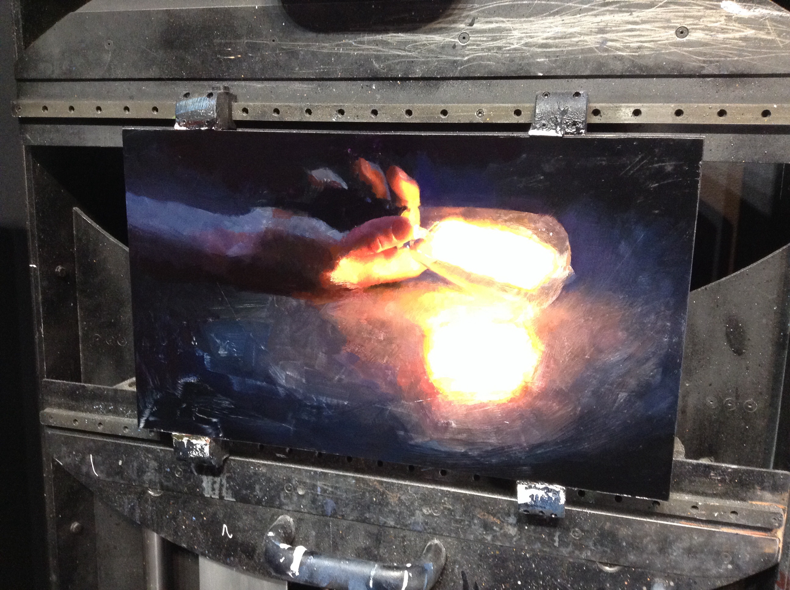 Since day 2 of the workshop will be us painting from life I went back to the hotel room to experiment with the materials that Casey recommended for the class. At least the brushes and the palette. I am using a slightly different medium than he is and he is painting on panels while all I brought are canvases. I added a bit more to this piece in progress