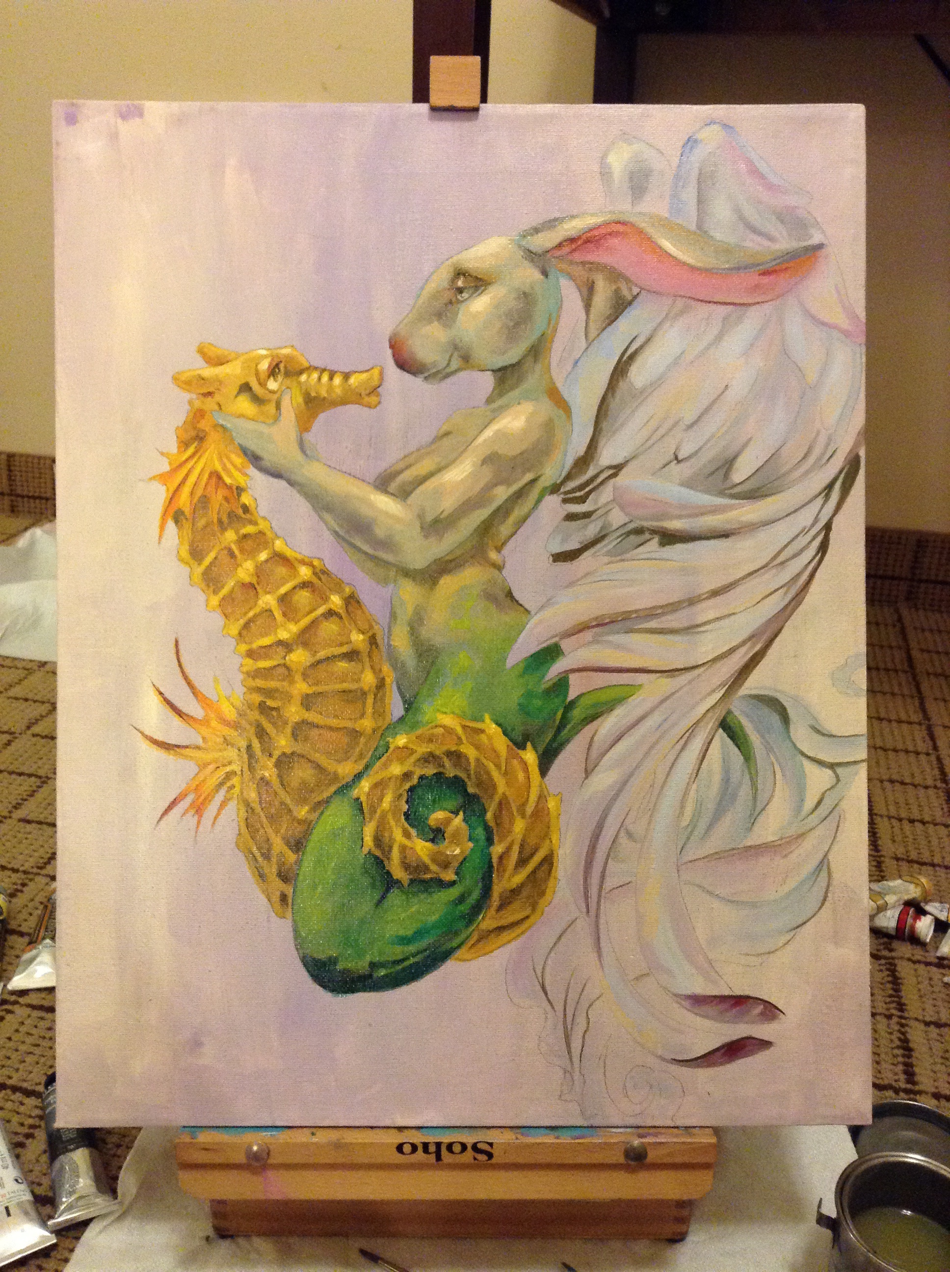 Then I started putting paint in the canvas for this one. Unfortunately I had already transferred the drawing to the surface, so I wasn’t able to try out Casey’s painting style, but I was still grateful to have the opportunity to experiment with the brushes and palette before I attempt a human in Day 2.