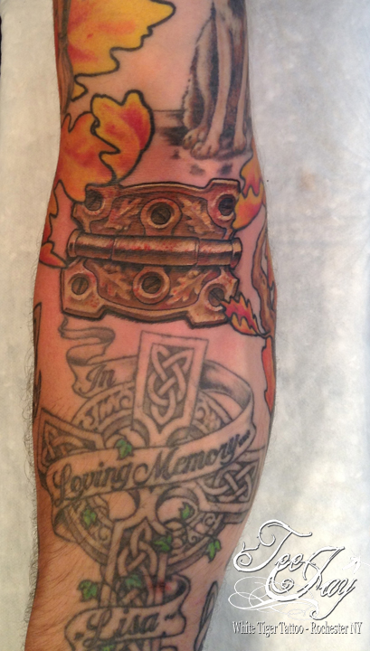 A friend’s daughter turned 18 and got this tattoo. She has been waiting a very long time to have this done. The drawing is a flash piece modified very slightly and the colors are her request.