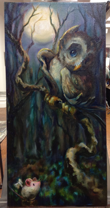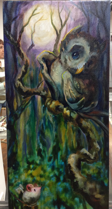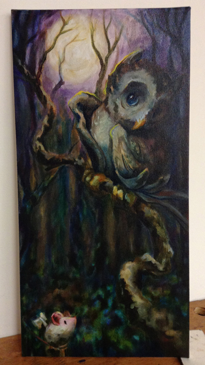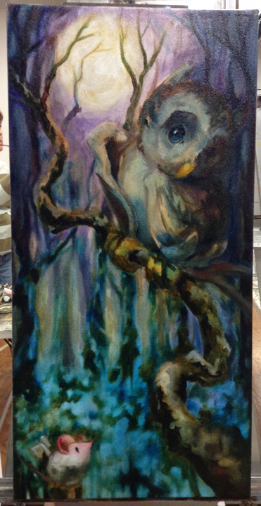 I think that the blow by blow painting shots are less interesting once I get into the refining process – but many people have told me that they enjoy seeing the process throughout. So here is today’s progress on this little owl painting. I really hadn’t intended to paint so many owls, but one has to go where the muse leads.
