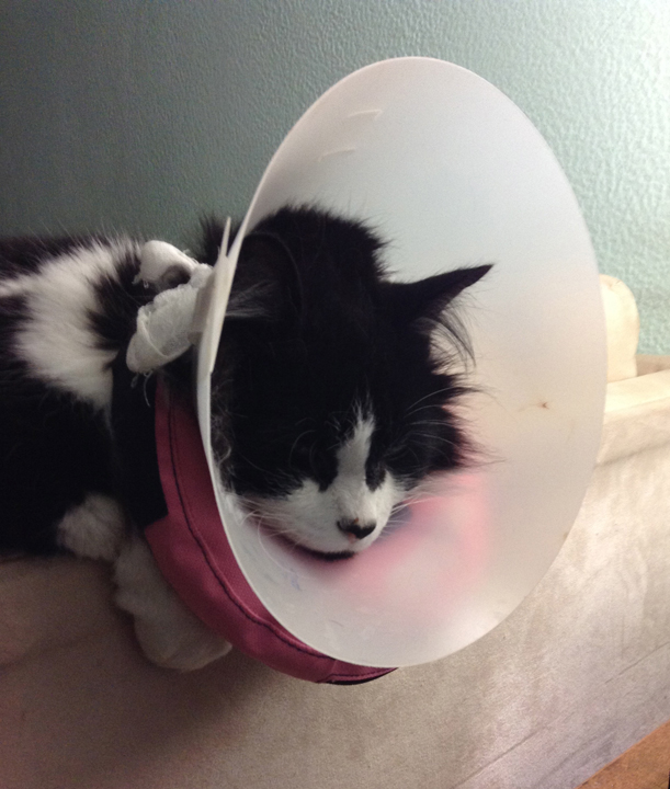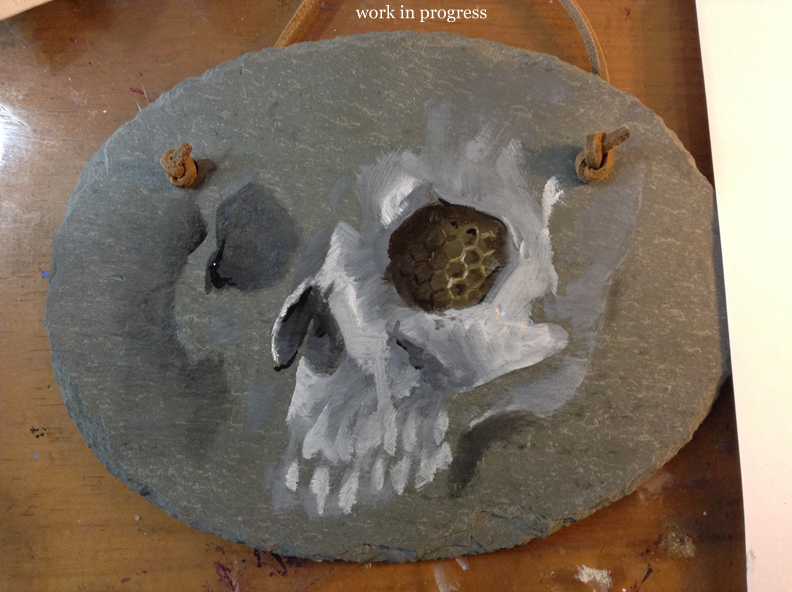 Toby had his surgery and it turns out that the mass that they removed was indeed cancer. We are hoping that they got it all and it did not appear to be into his lymph nodes. I will find out more when I go back on Monday to have his stitches out. In the meantime we have a very unhappy cat in a cone. While he was in surgery I worked on this little slate piece for a friend. She had asked for something for her garden that was more her than “just cheesy flowers”. I gave it to her today and she thinks it is too nice to put in the garden (which I think is really sweet). She said she finds these little slate signs at thrift stores all the time so I asked her to pick me up some when she comes across them. Super easy to paint on I think I would have fun making some more.