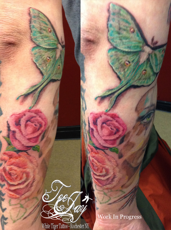 Gretchen came in for her Grandma Mermaid tattoo. I can’t tell you how much I was looking forward to this. For a minute it looked like my eye doctor was conspiring to prevent this tattoo from happening… but despite the late start we got a great session in and got Grandma finished. Thank you Gretchen for being patient, bringing me great ideas and becoming a friend in the process.