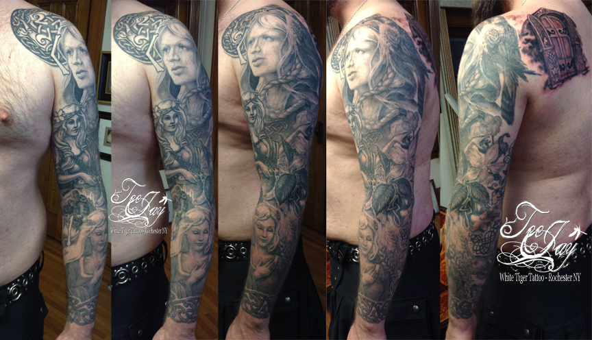 Added the last piece onto Casey’s Norse Goddess sleeve by adding Freyja’s Hall. Both arms are now complete and we will start next on a really ambitious project which for the moment I am choosing to keep secret. I assure you it will be AMAZING! Or amazeballs if you prefer 🙂