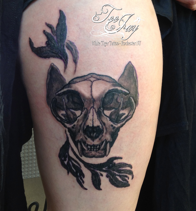 Britt and I had seen a display of kitty bones laid out with the pelvic bones next to the head approximating ears. We liked the idea, but the reality makes the “ears” too large. So we used the same idea, made the ears smaller (artistic license) and added a bit of brush sage. The only thing that could have made this better is if we had gotten to tattoo it on Caturday 🙂