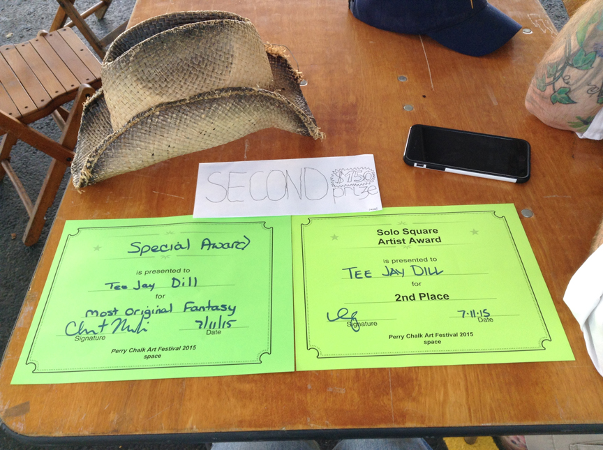 I have to tell you that the Town of Perry or the Chalk Art Festival Committee or whoever it is that is actually behind the scenes on this does an AMAZING job. I have been to tattoo conventions that I have paid hundreds of dollars to attend and never been treated this well. They came by periodically with ice cold water and had a couple of adorable kids that came by several times with cold fresh drinks and fresh fruit. Even had myself an nice cold chocolate milk. Haven’t had one of those in forever.