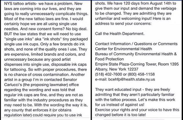 I am writing to address the newest legislation that was just signed concerning the tattoo industry in New York State, specifically the regulation of pre-packaged single use inks.
