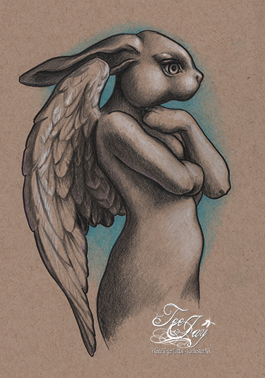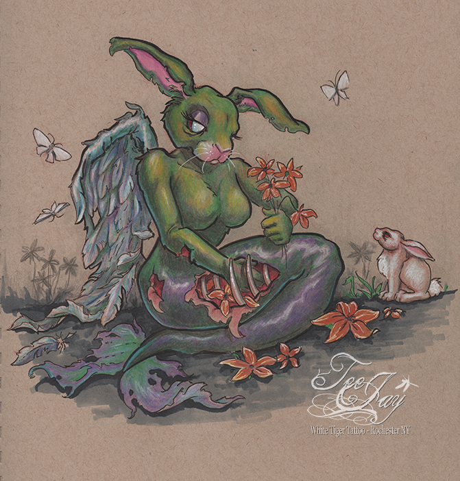 Day 8 – Zombie. Certain friends and I will talk once in a while about our aversion to wet dead (as opposed to dry dead). I do fine with dry dead. Taxidermy. Bones. Things that are dry, don’t squish and don’t look like they would smell badly. Zombies do not fall into the dry dead category. Therefore I am not nearly as enamored with zombies as some of my friends tend to be. I think that my winged merbunny would feel the same way. I believe that if she found herself turned in a zombie way, she would make every attempt to try and make the best of the situation.